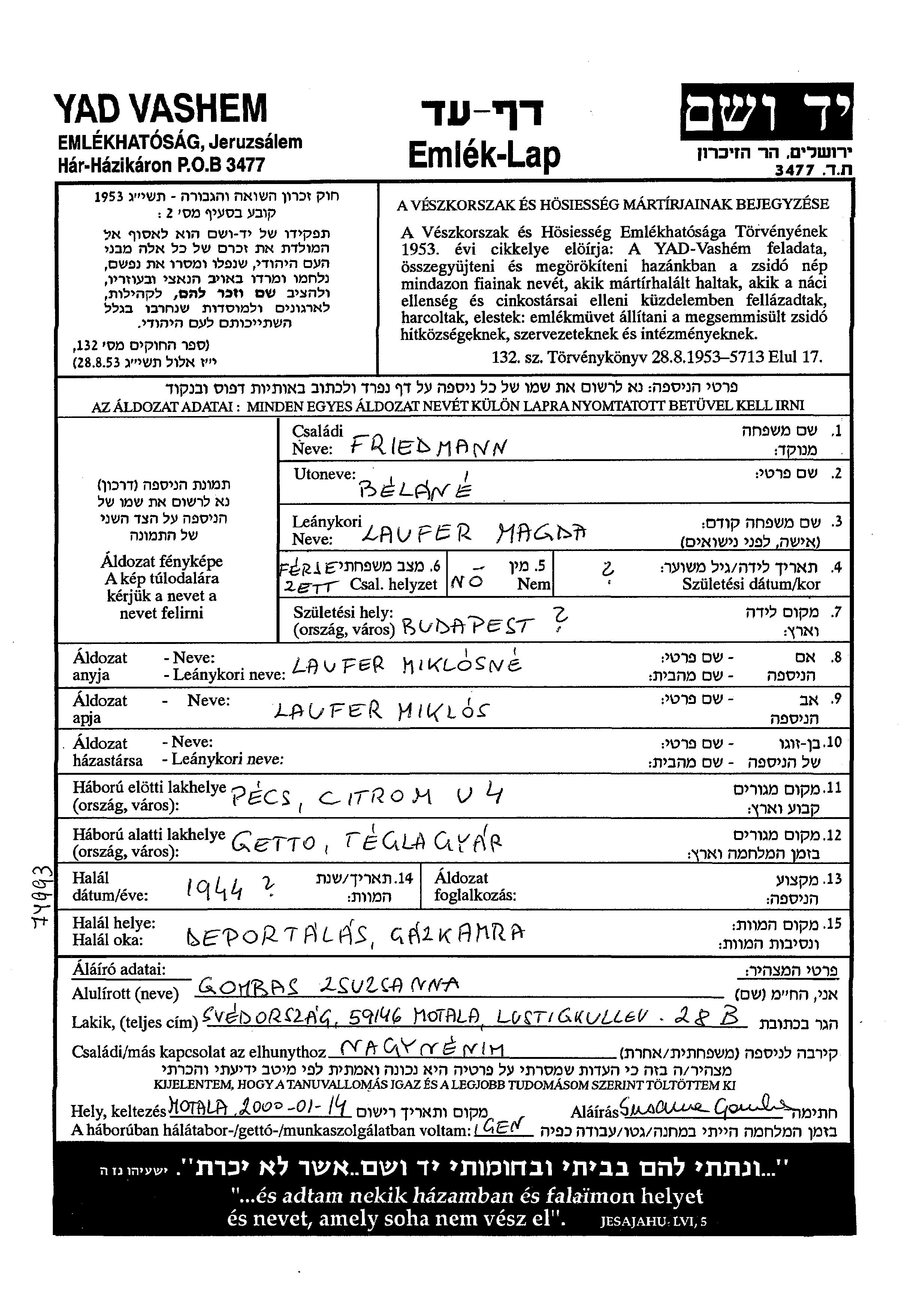 Магда Фридманн, девичья фамилия Лауфер, место рождения: Будапешт, Венгрия. Отец: Миклош. Женат / замужем. Место жительства до войны: Печ, Венгрия. Место во время войны: Печ, Венгрия.