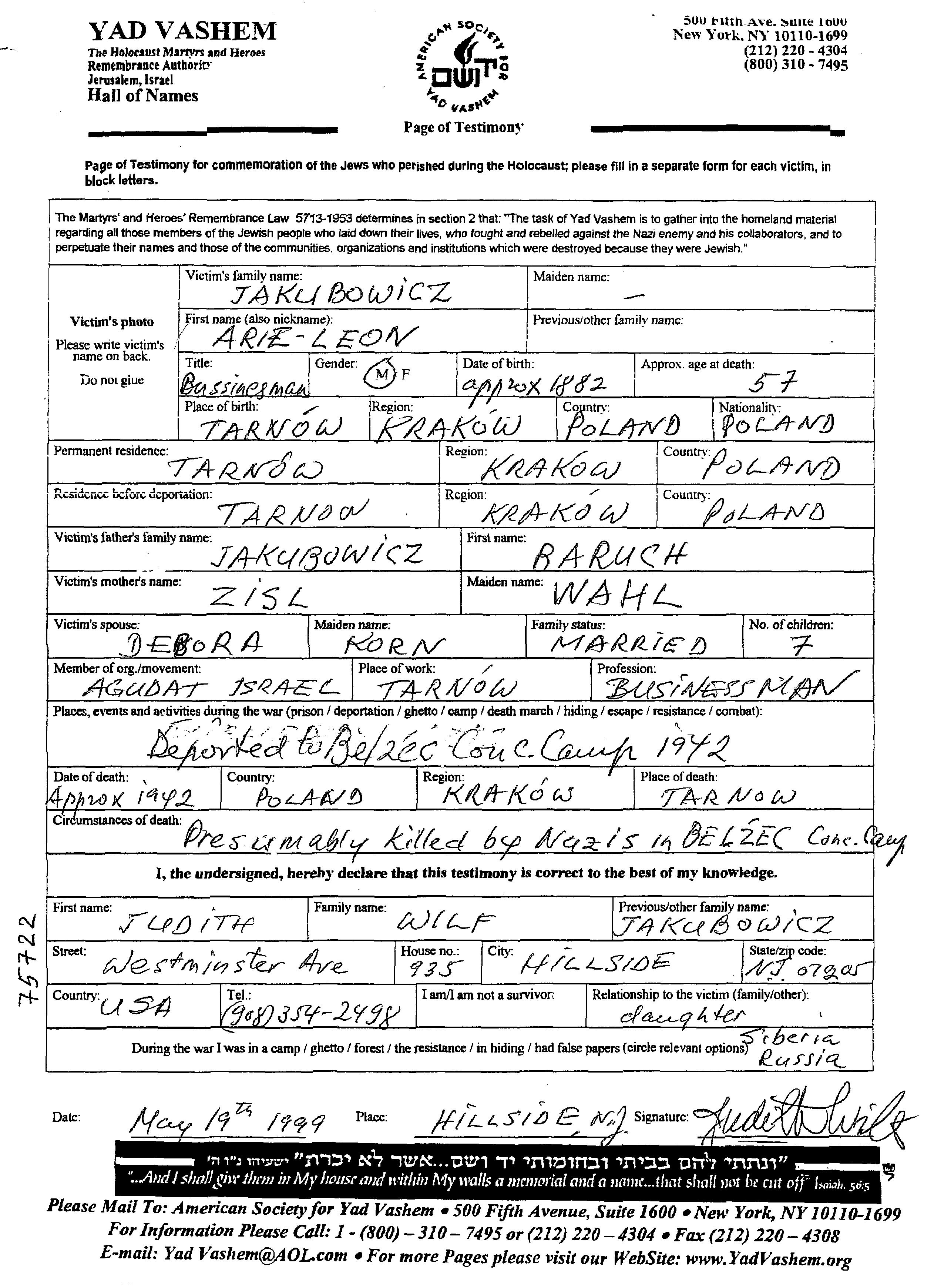 Арье Леон Якубович, место рождения: Тарнув, Польша. Отец: Барух, mать:Зисл. Предприниматель. Женат / замужем. Место жительства до войны: Тарнув, Польша. Место во время войны: Тарнув, Польша.