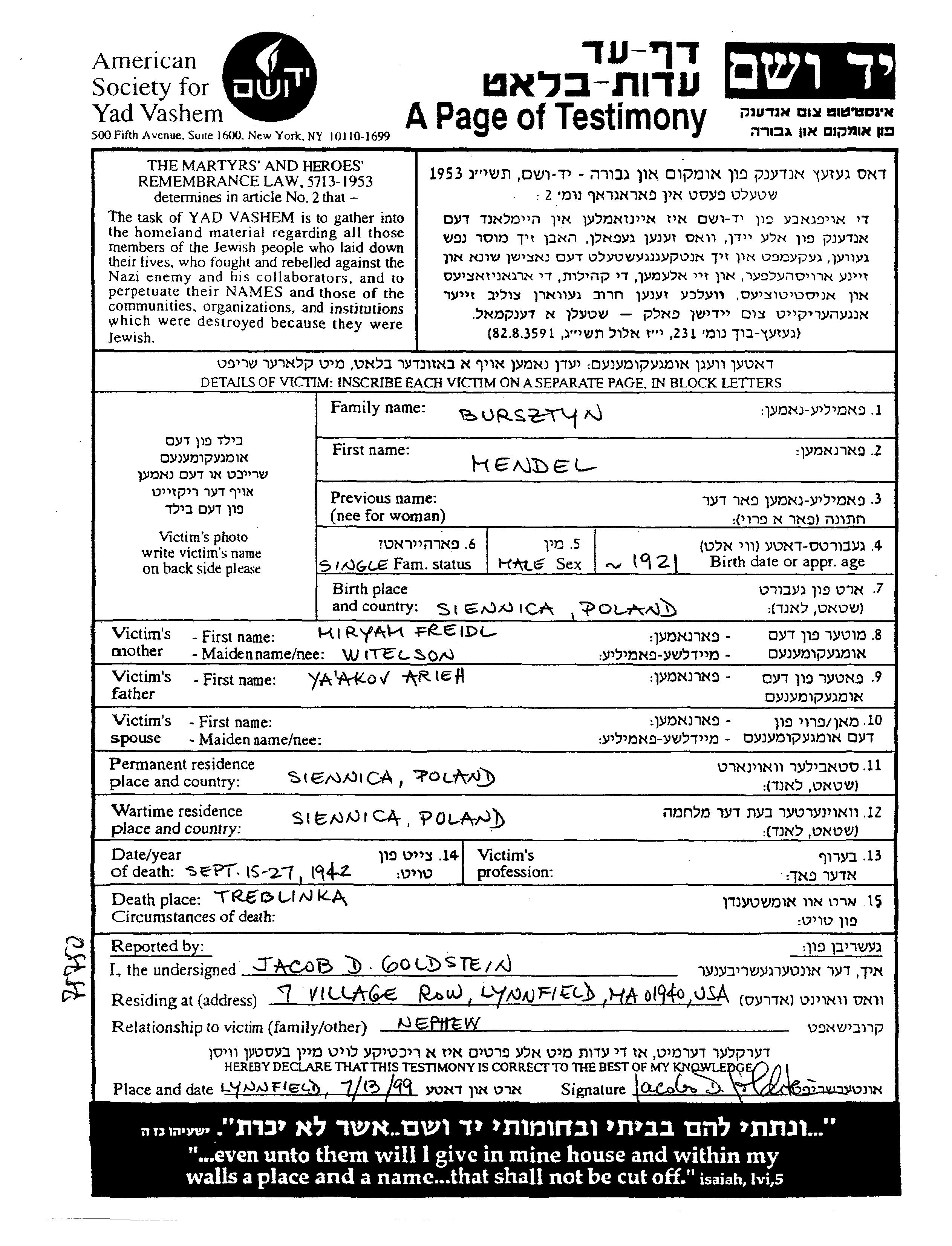 Мендель Бурштин, место рождения: Сенница, Польша. Отец: Яков Арье, mать:Мирям Фрейдл. Холост / не замужем. Место жительства до войны: Сенница, Польша. Место во время войны: Сенница, Польша.
