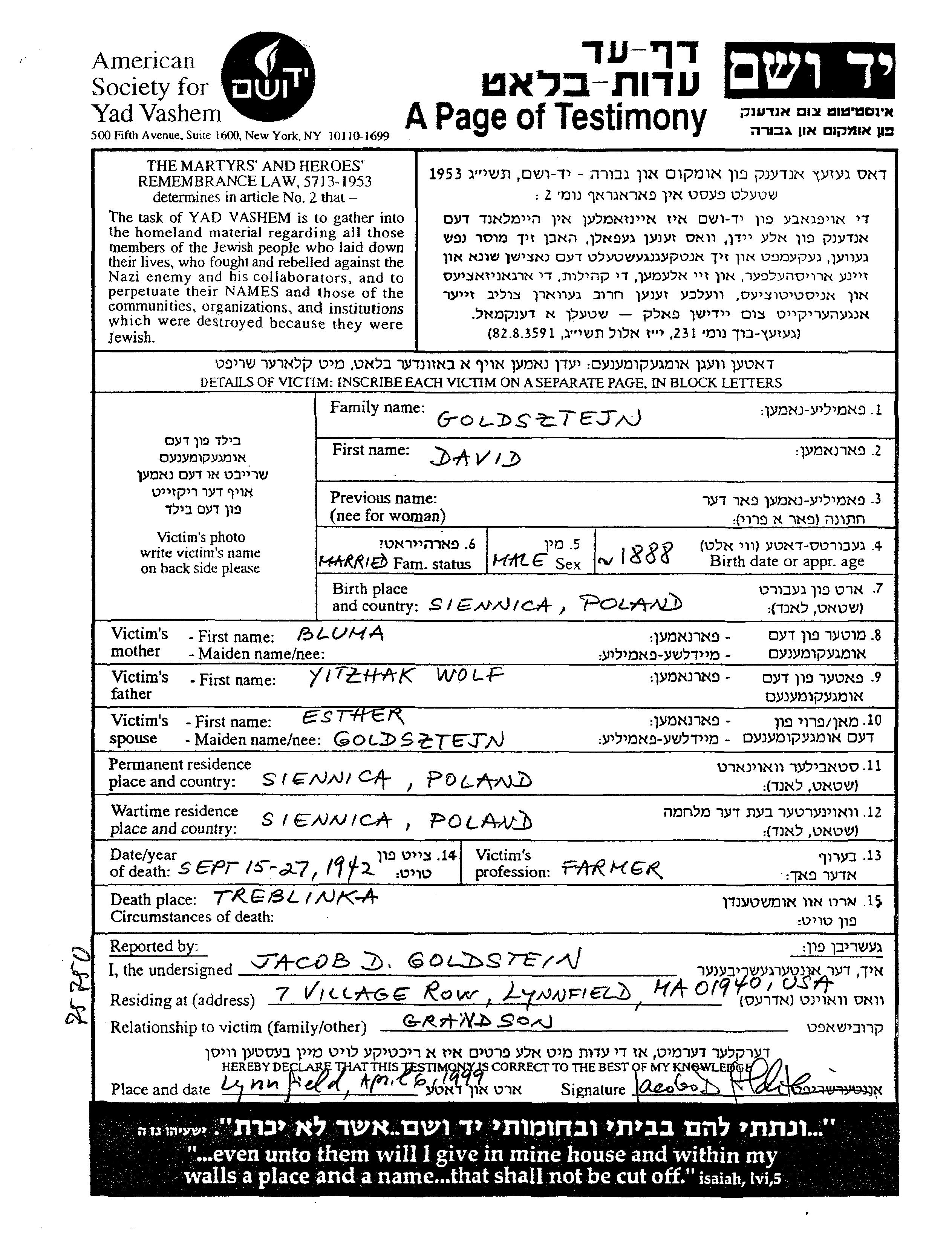 Давид Гольдштейн, место рождения: Сенница, Польша. Отец: Ицхак Вольф, mать:Блюма. Земледелец / земледелица. Женат / замужем. Место жительства до войны: Сенница, Польша. Место во время войны: Сенница, Польша.