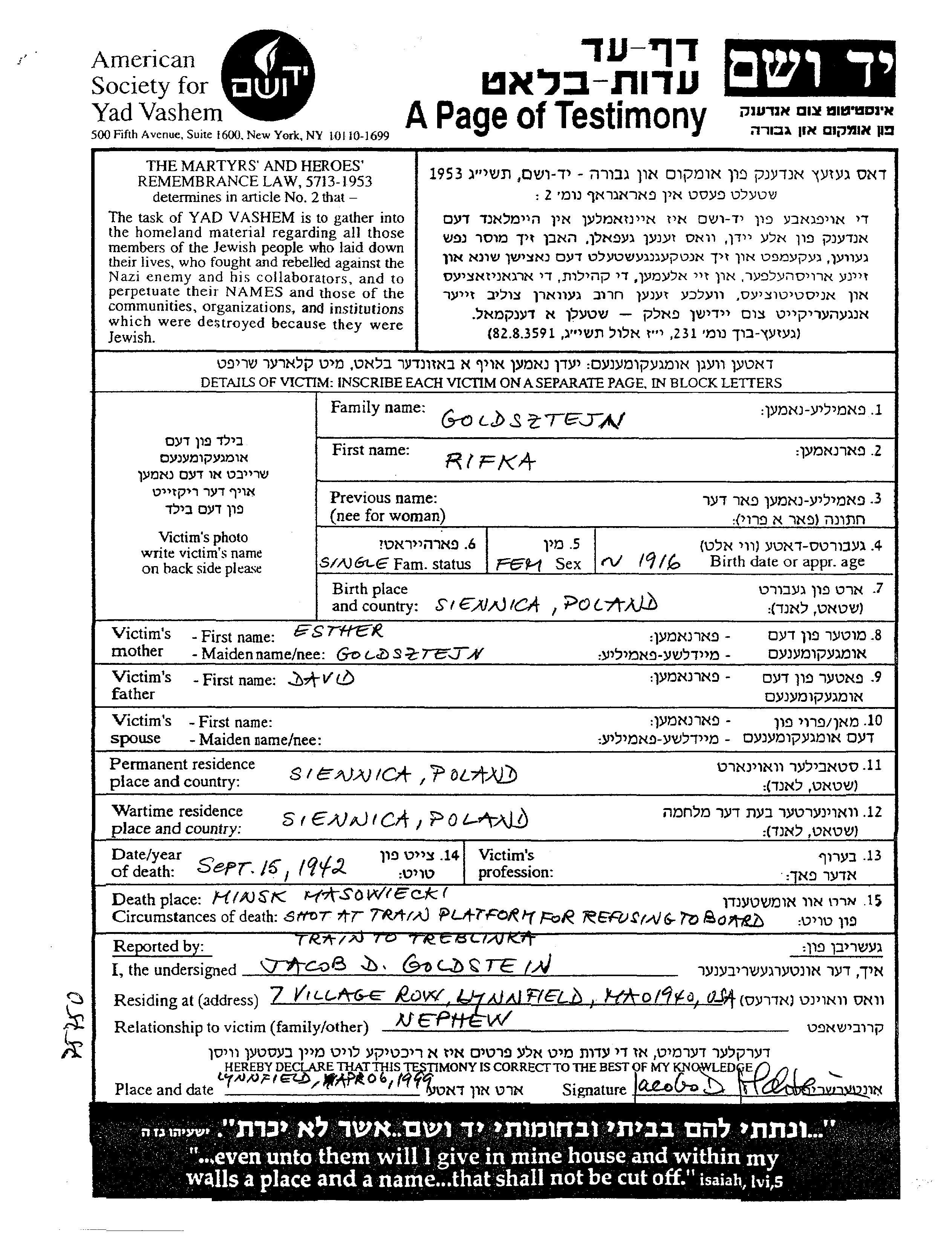 Рифка Гольдштейн, место рождения: Сенница, Польша. Отец: Давид, mать:Эстер. Холост / не замужем. Место жительства до войны: Сенница, Польша. Место во время войны: Сенница, Польша.