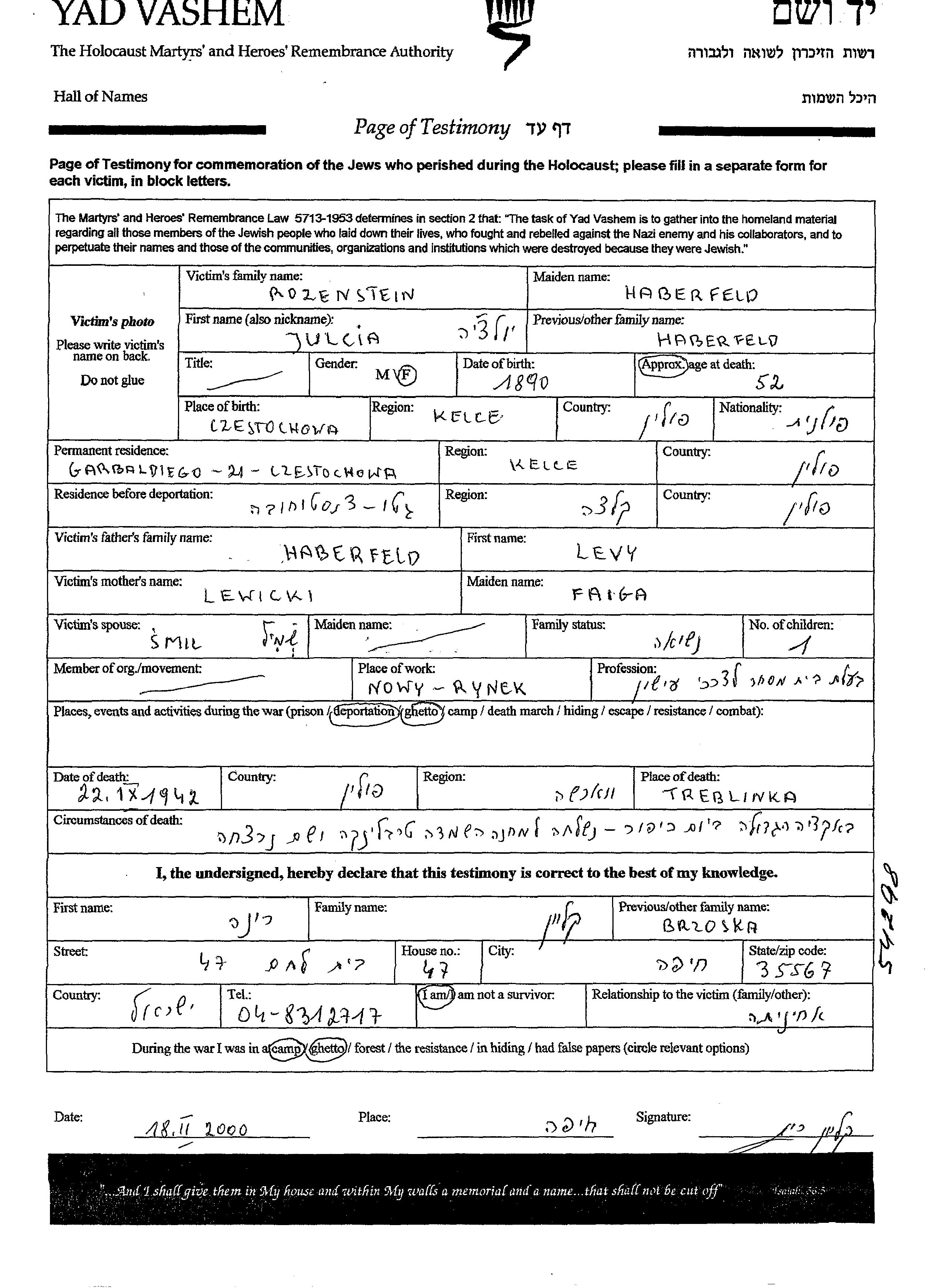 Йолан Юльча Розенштейн, девичья фамилия Хаберфельд, место рождения: Ченстохова, Польша. Отец: Леви, mать:Файга. Владелец / владелица торговой фирмы. Женат / замужем. Место жительства до войны: Ченстохова, Польша. Место во время войны: Ченстохова, Польша.
