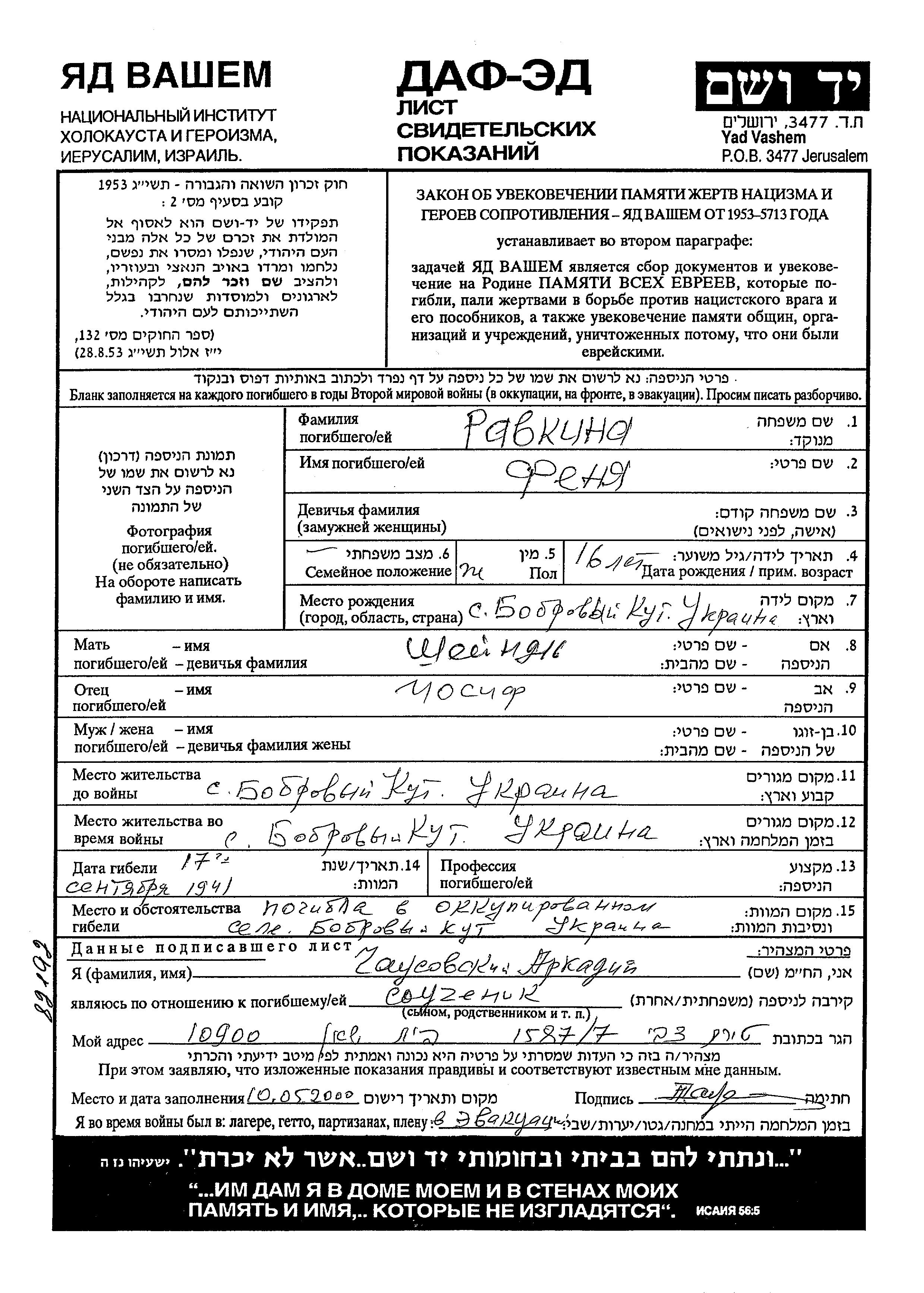Равкин Феня Bobrovyy Kut, Украина (СССР) Лист свидетельских показаний