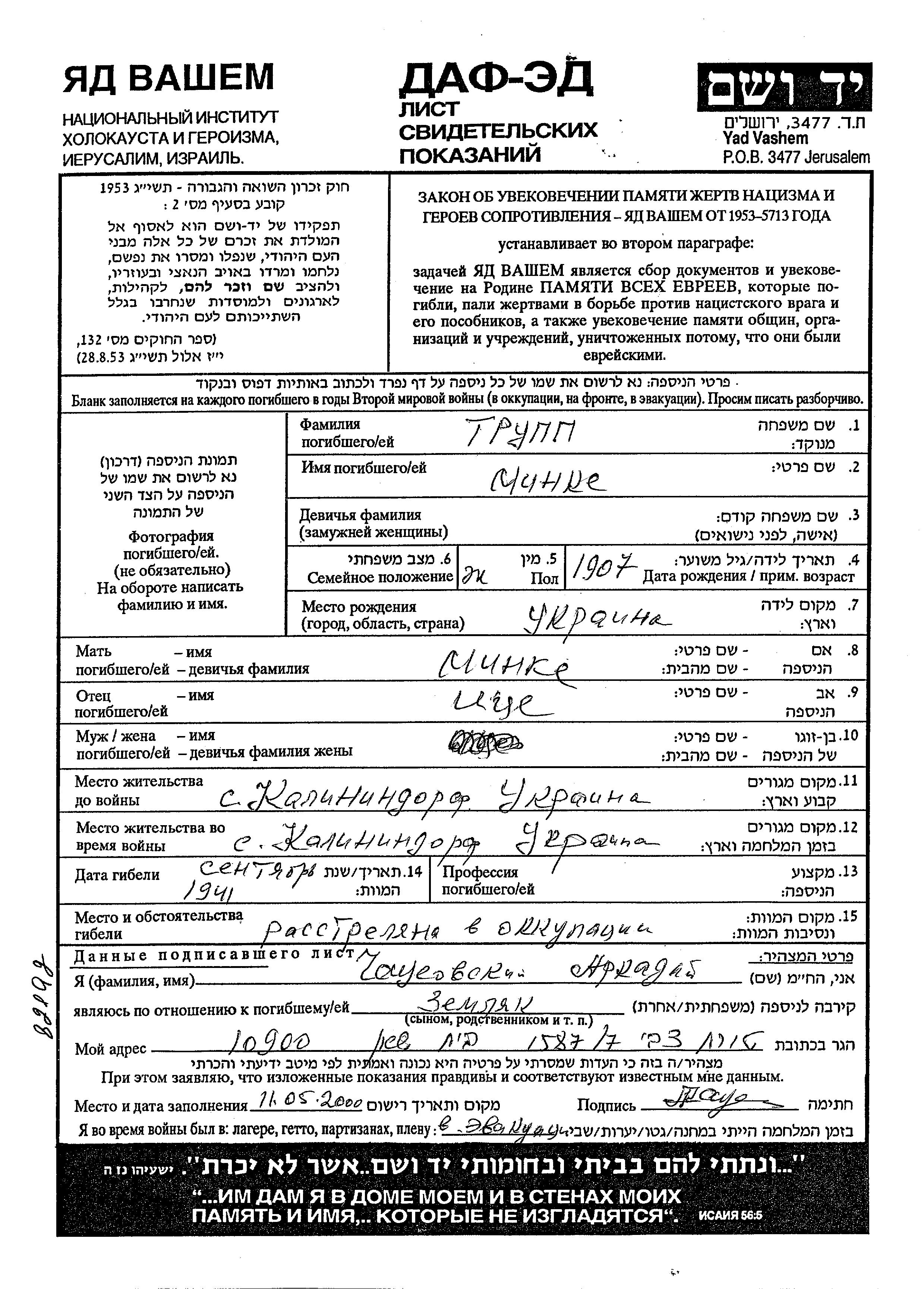 Яд Вашем - Листы свидетельских показаний Мемориального фонда