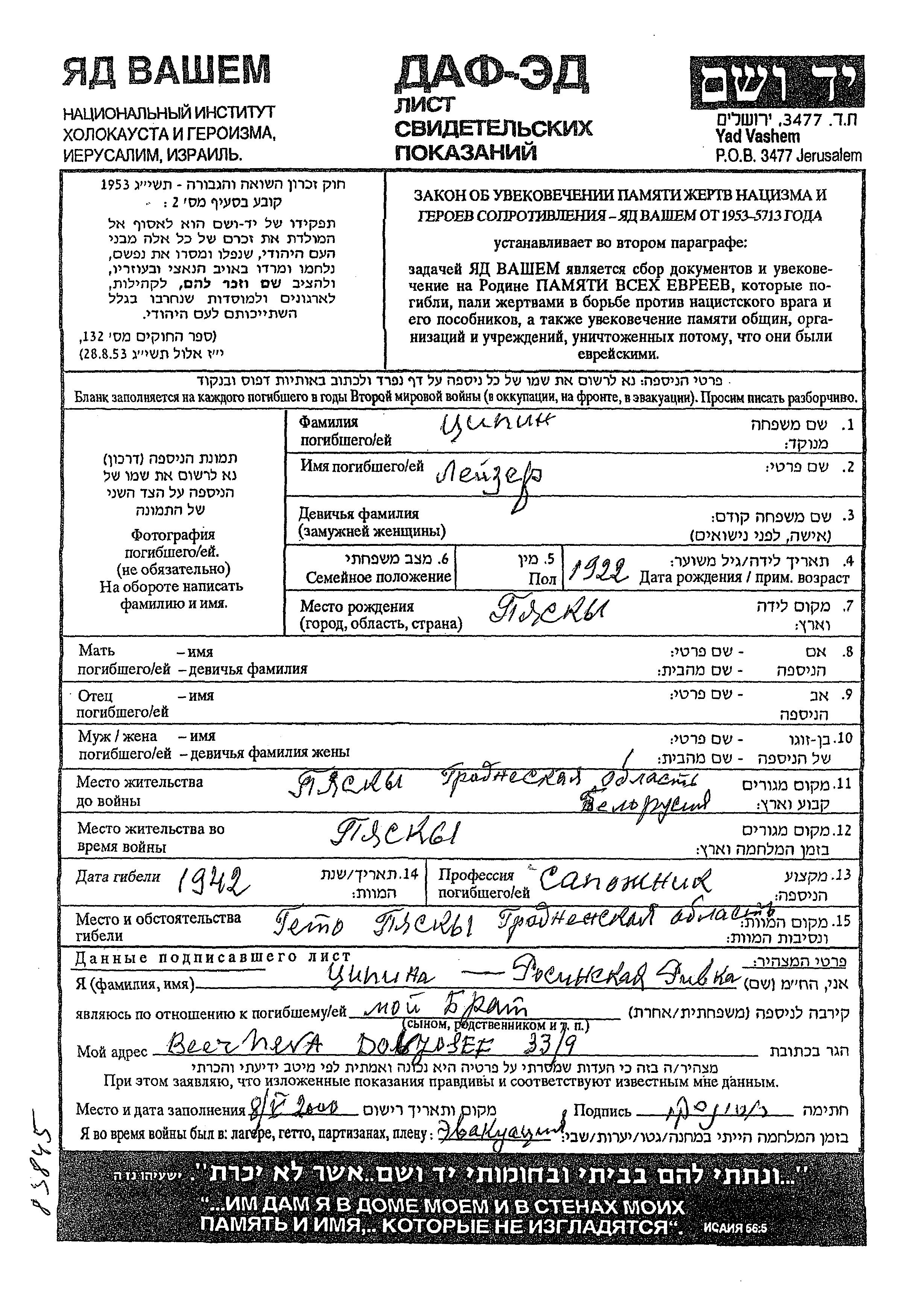 Ципин Лейзер 1922 Пяски, Польша Лист свидетельских показаний