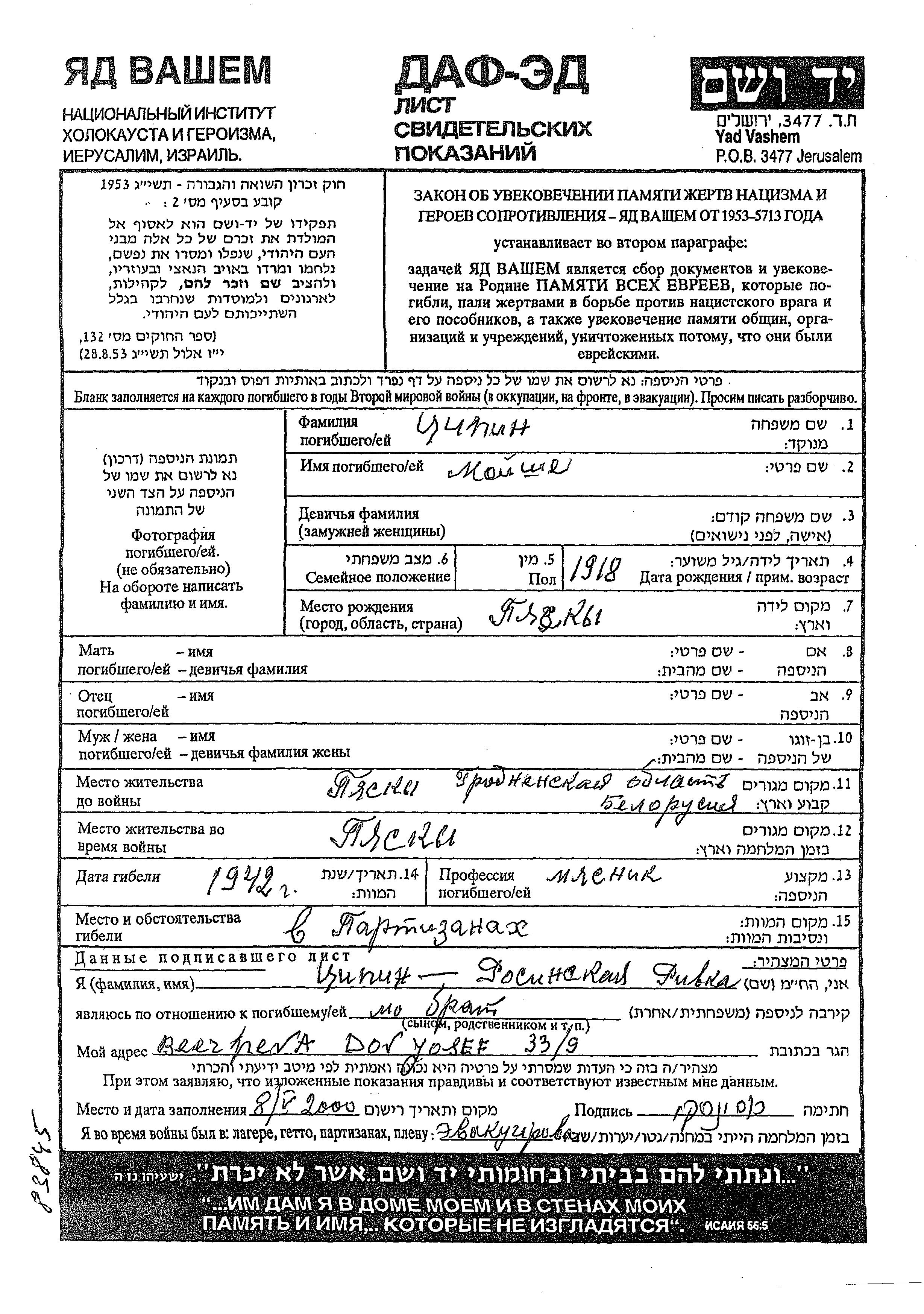 Яд Вашем - Листы свидетельских показаний Мемориального фонда