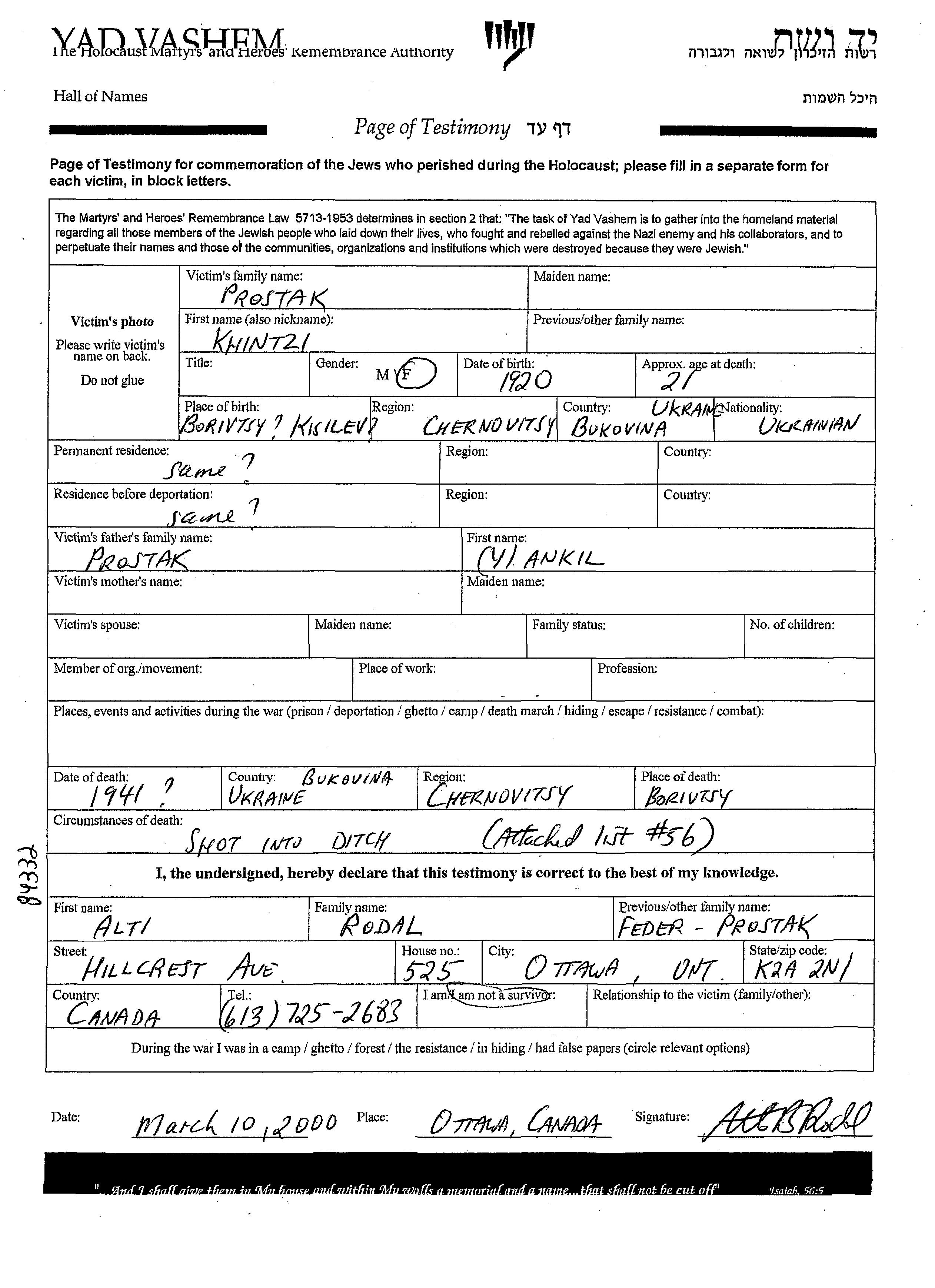 Хинци Простак, место рождения: Боривцы, Румыния. Отец: Янкиль. Место жительства до войны: Боривцы, Румыния. Место во время войны: Боривцы, Румыния.