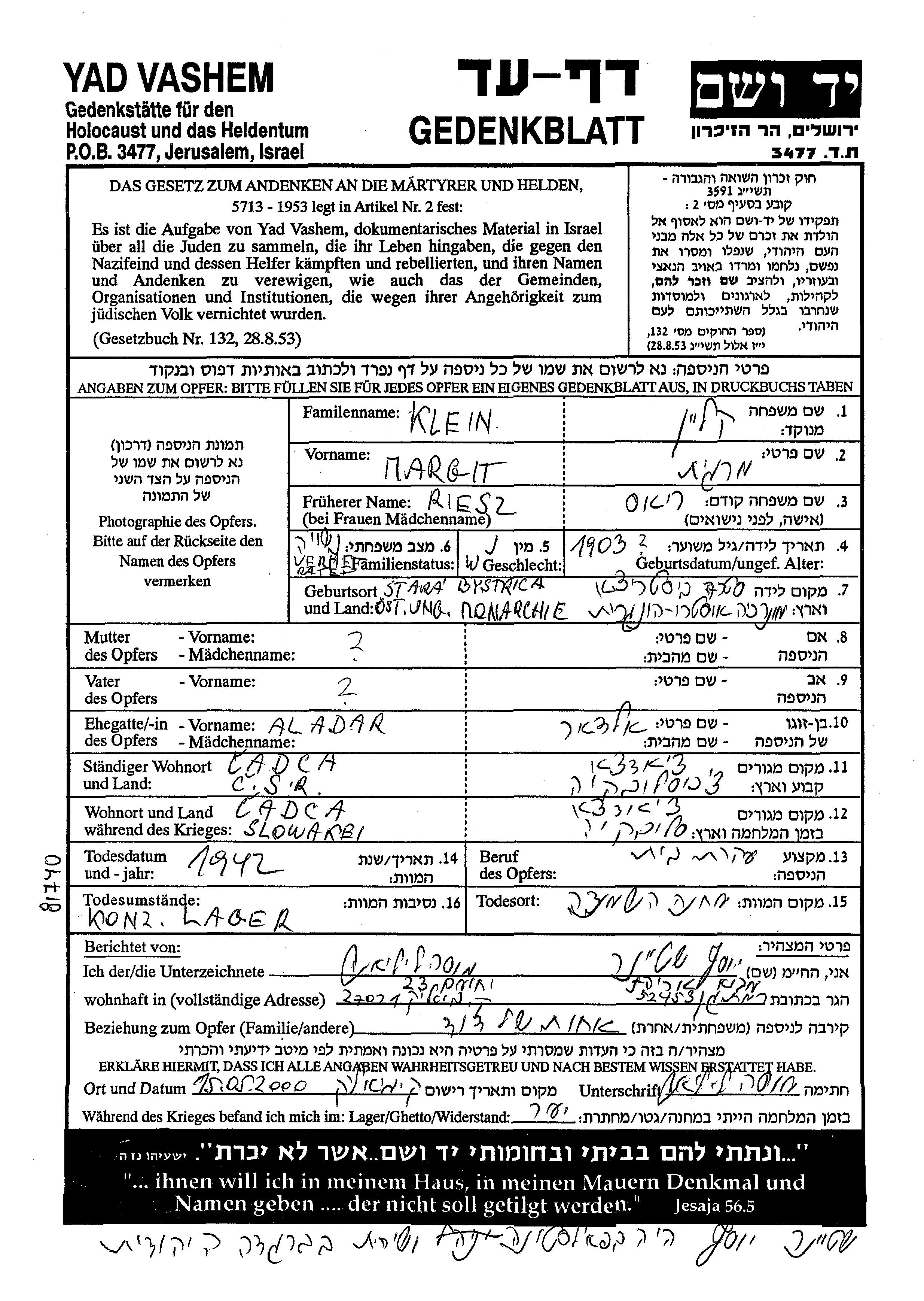 Маргит Клейн, девичья фамилия Рис Риес, место рождения: Стара Быстрица, Чехословакия. Домохозяйка. Женат / замужем. Место жительства до войны: Чадца, Чехословакия. Место во время войны: Чадца, Чехословакия.