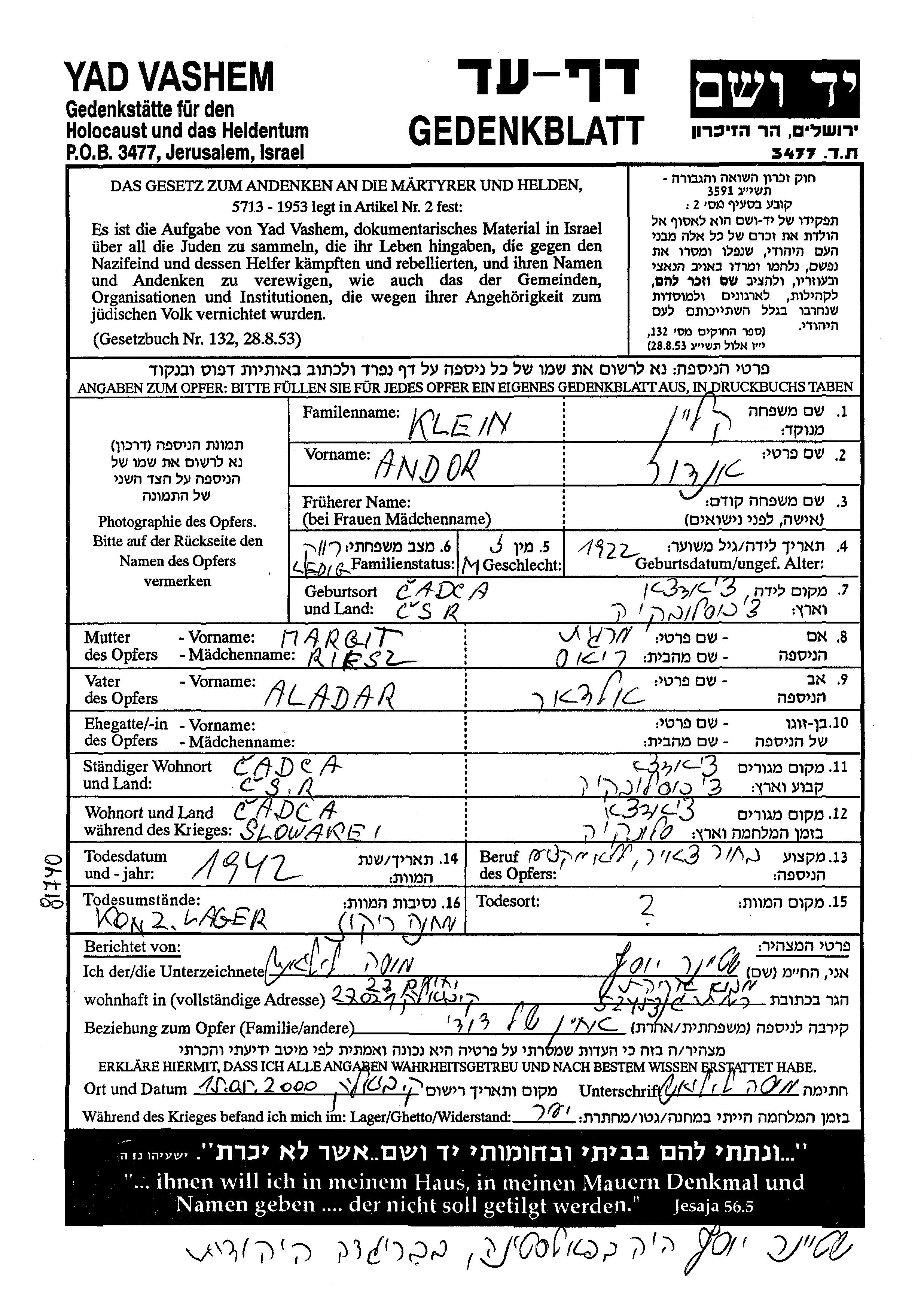 Андор Клейн, место рождения: Чадца, Чехословакия. Отец: Аладар, mать:Маргит. Холост / не замужем. Место жительства до войны: Чадца, Чехословакия. Место во время войны: Чадца, Чехословакия.