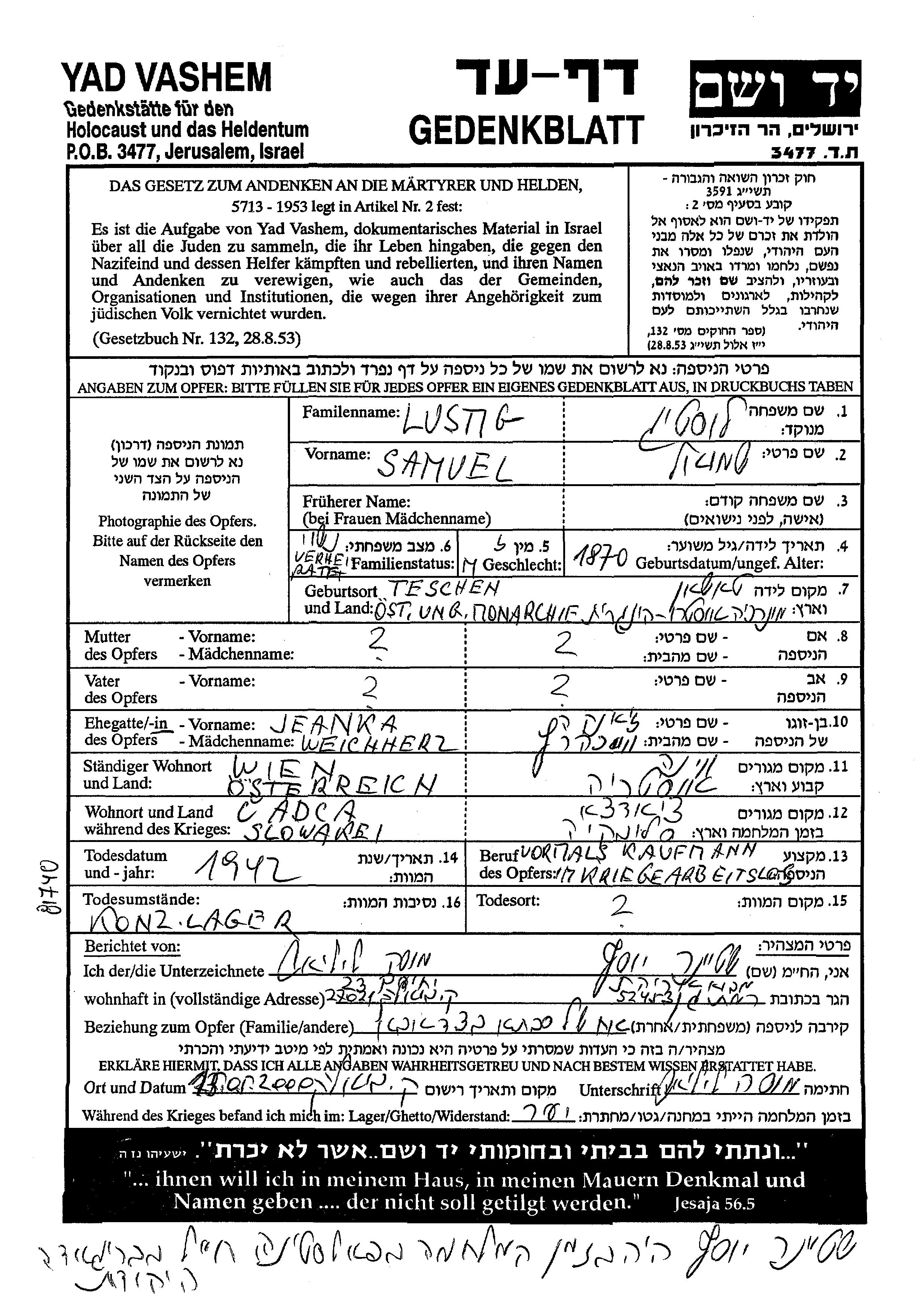 Шмуэль Люстиг, место рождения: Тешин, Чехословакия. Торговец / торговка. Женат / замужем. Место жительства до войны: Вена, Австрия. Место во время войны: Чадца, Чехословакия.