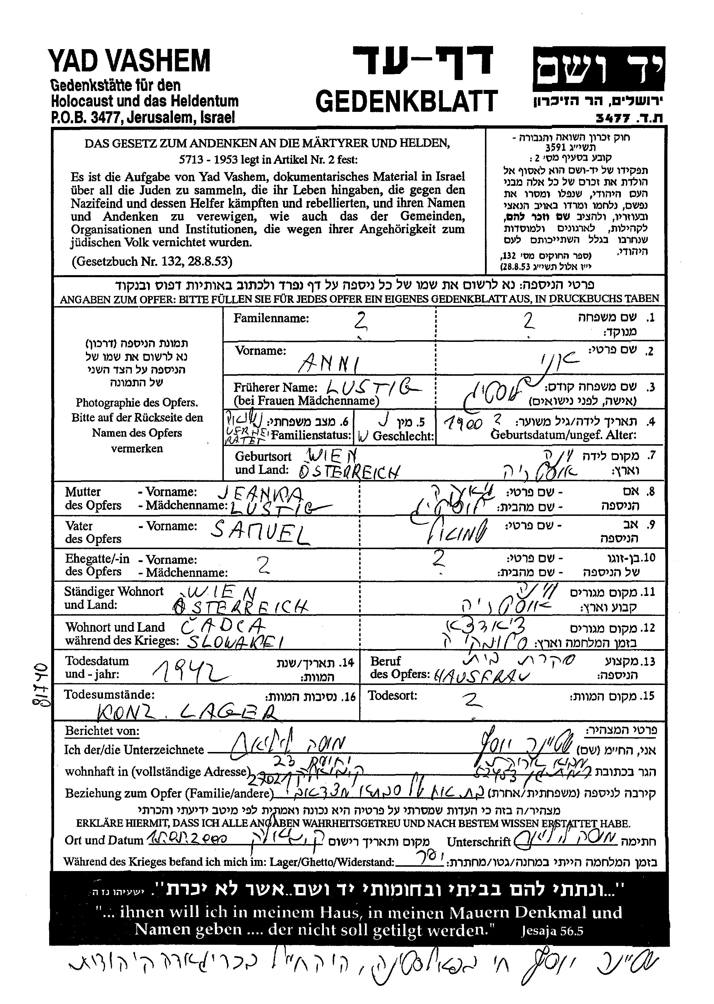 Анни Фамилия неизвестна, девичья фамилия Люстиг, место рождения: Вена, Австрия. Отец: Шмуэль, mать:Женька Янка. Домохозяйка. Женат / замужем. Место жительства до войны: Вена, Австрия. Место во время войны: Чадца, Чехословакия.