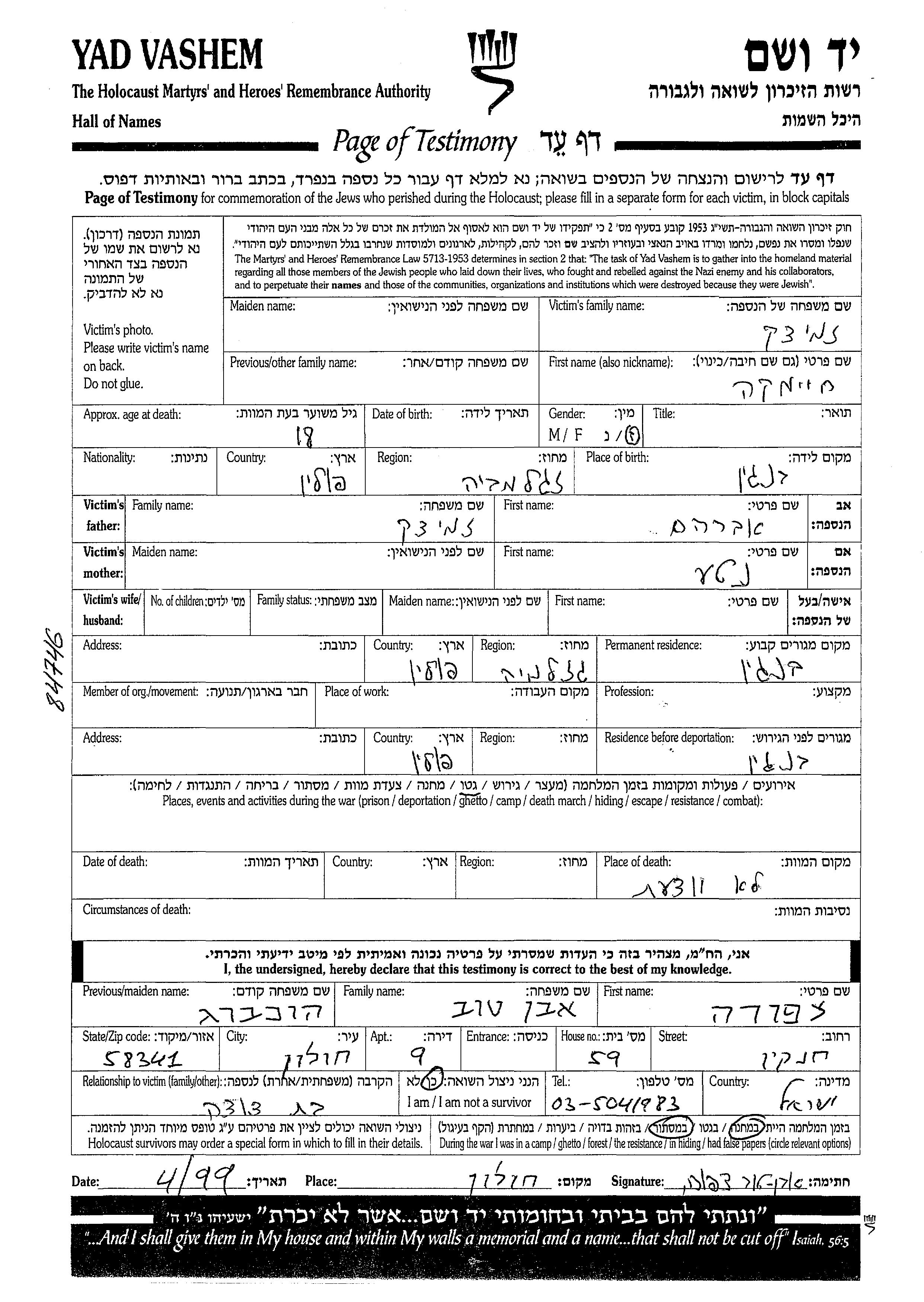 Яд Вашем - Листы свидетельских показаний Мемориального фонда