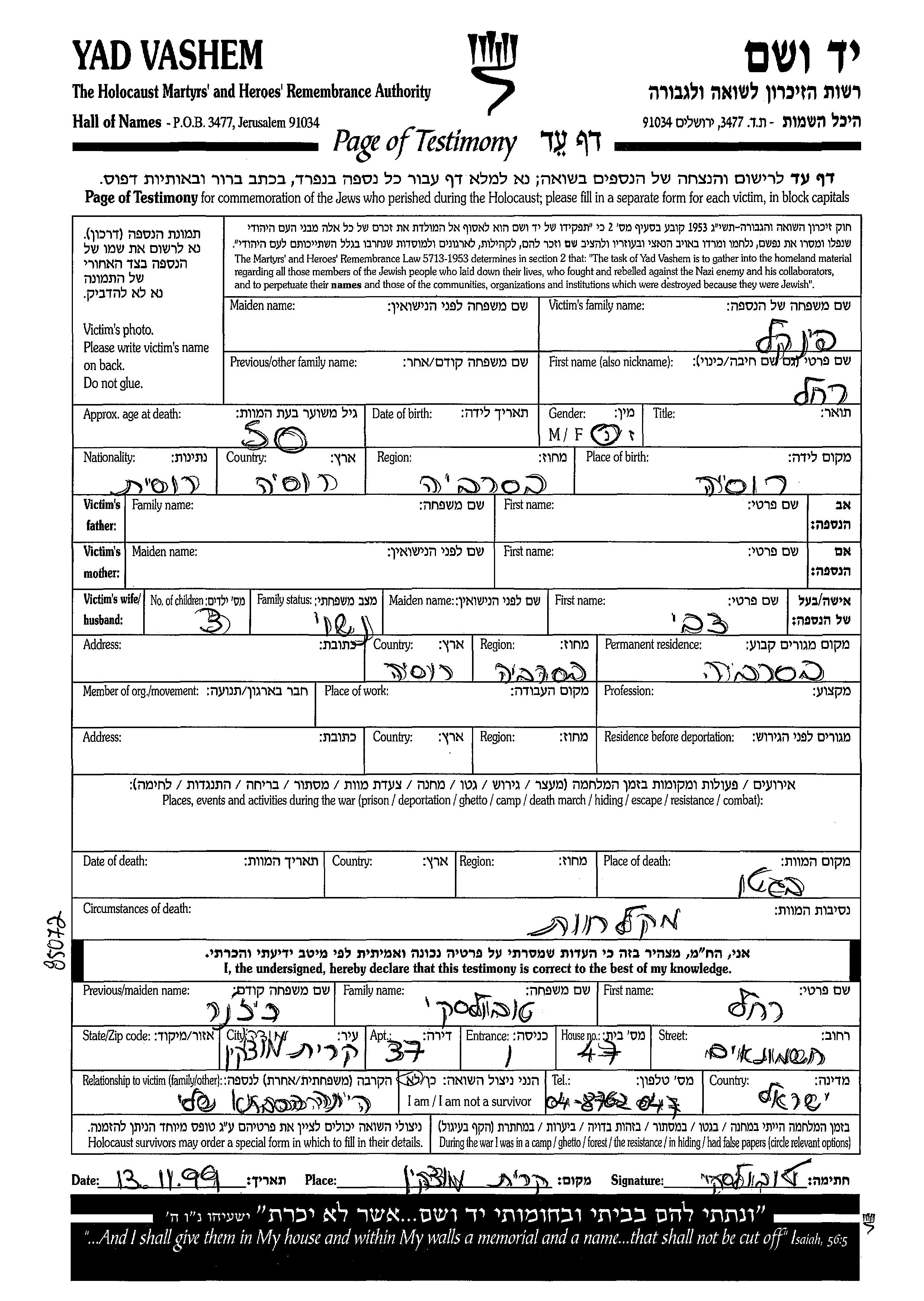 Яд Вашем - Листы свидетельских показаний Мемориального фонда