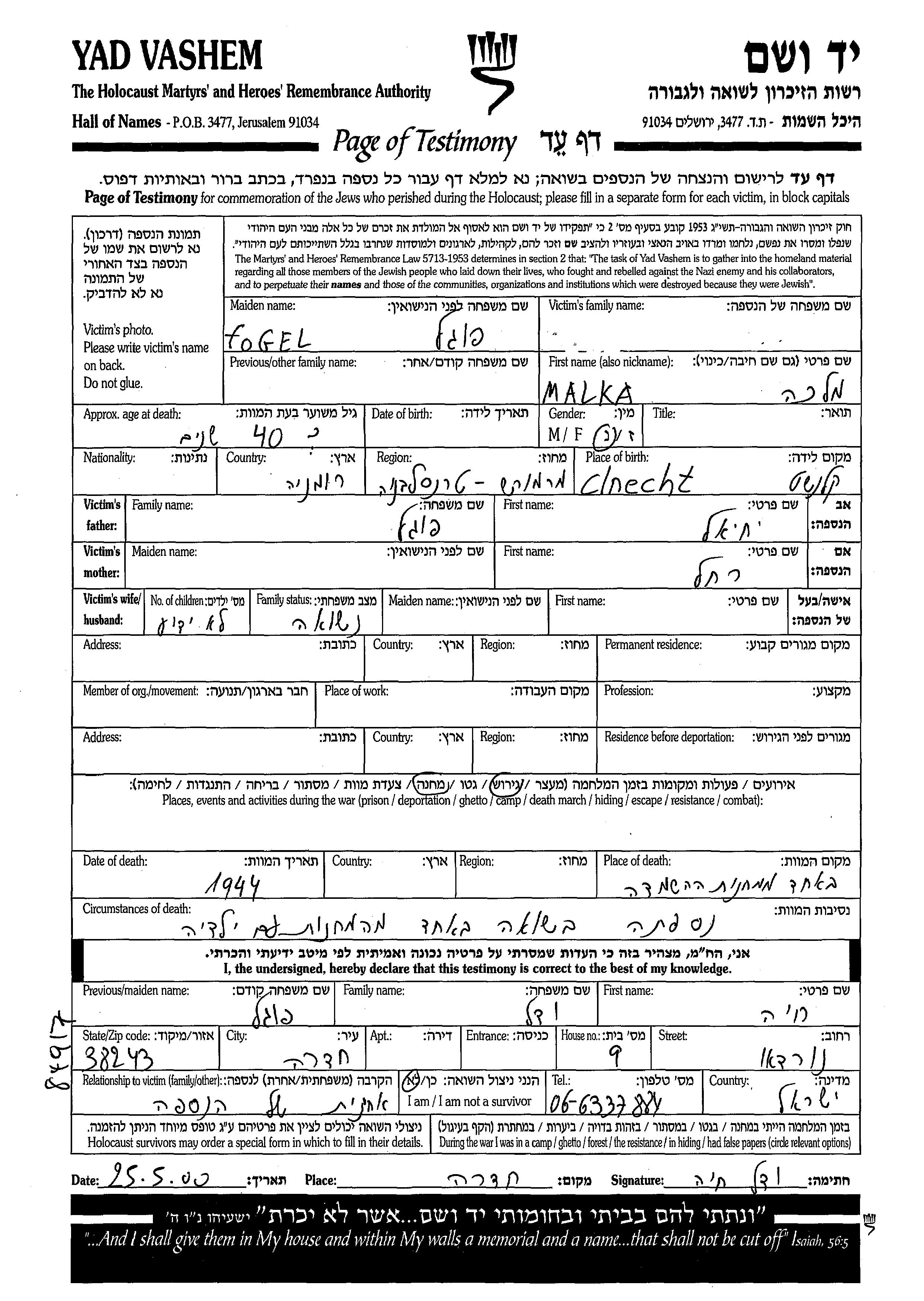 Малка Фамилия неизвестна, девичья фамилия Фогель, место рождения: Кэлинешть, Румыния. Отец: Иехиэль, mать:Рахель. Женат / замужем.