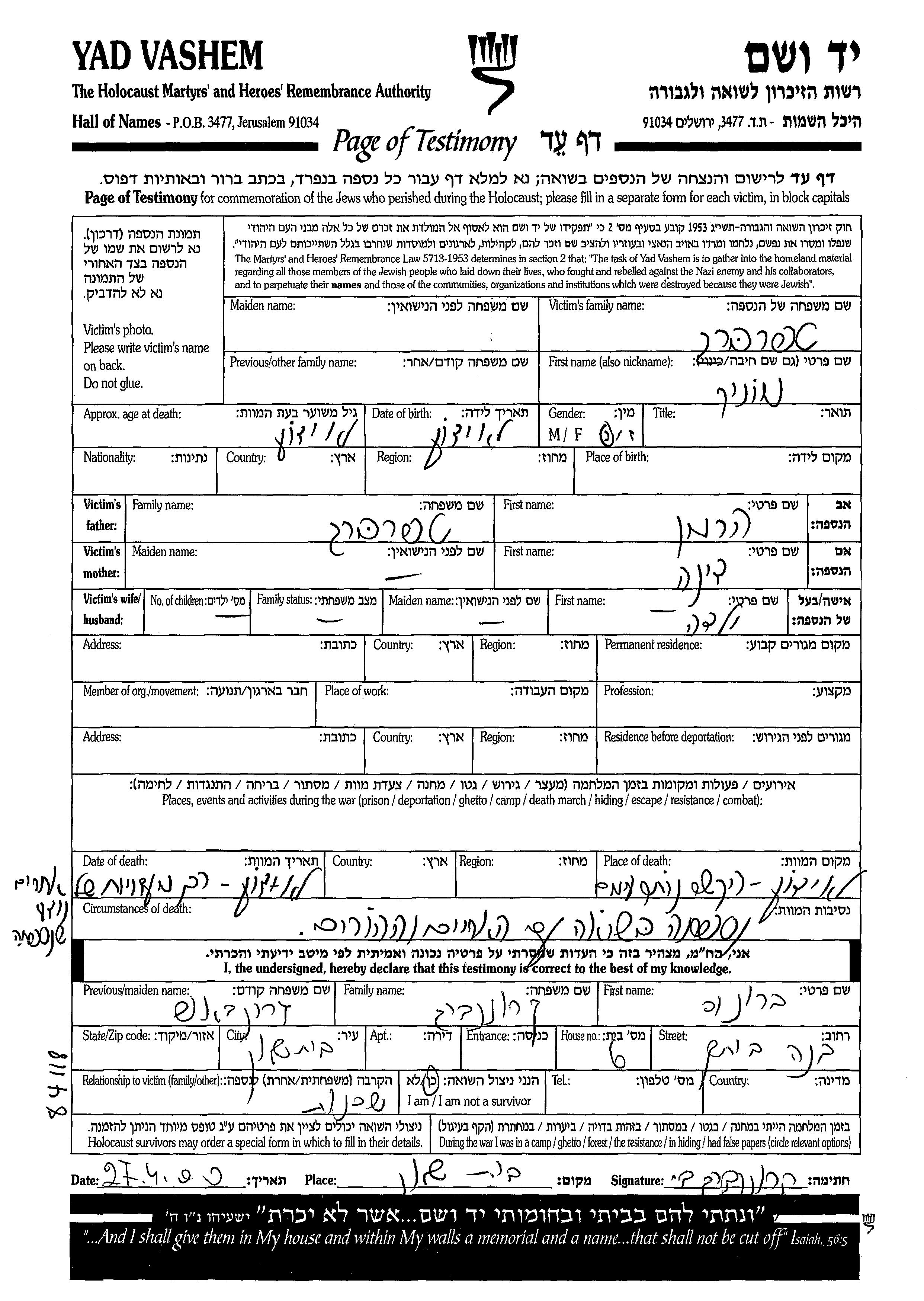Яд Вашем - Листы свидетельских показаний Мемориального фонда