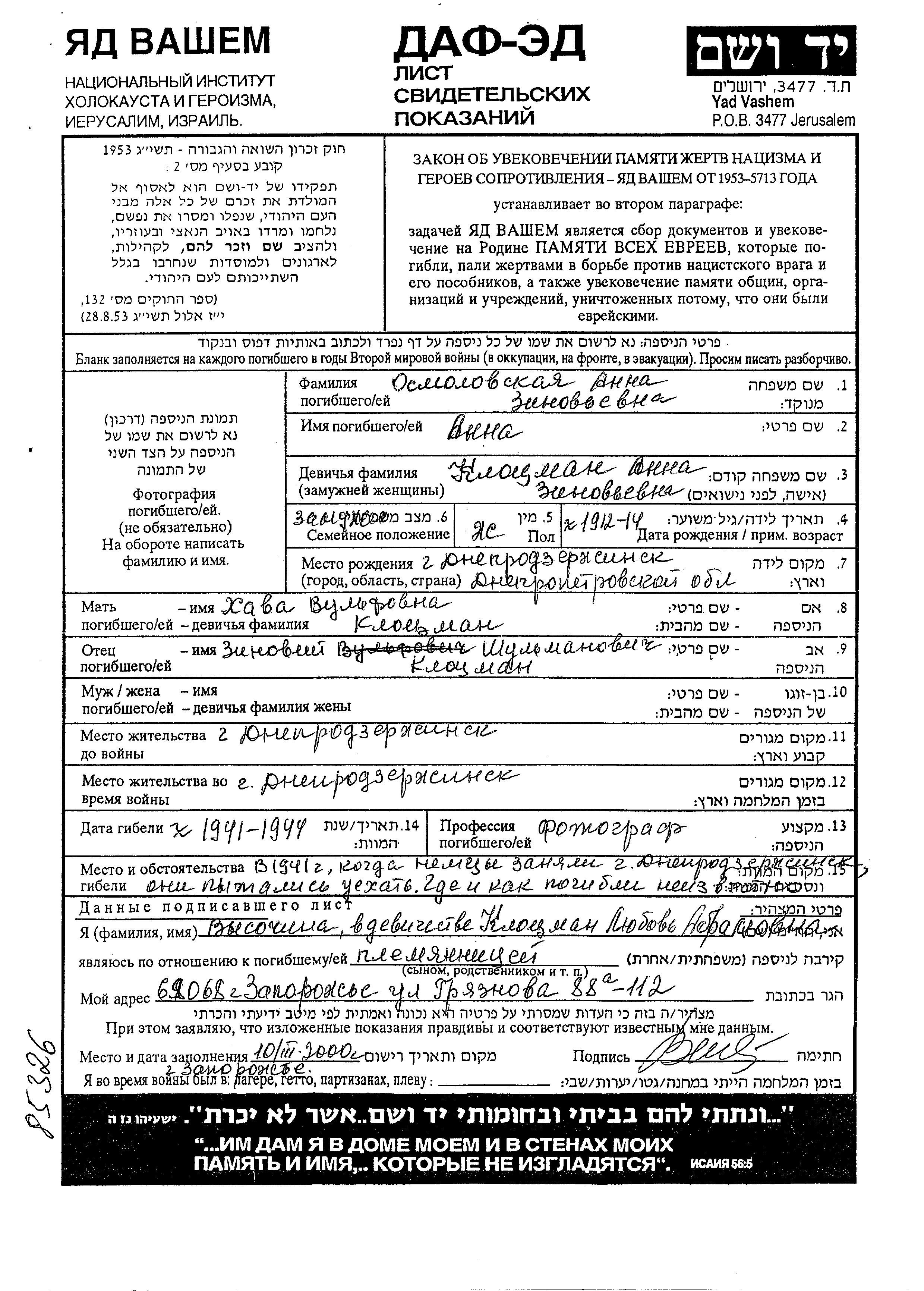 Осмоловский Анна 1912 Днепродзержинск, Украина (СССР) Лист свидетельских показаний