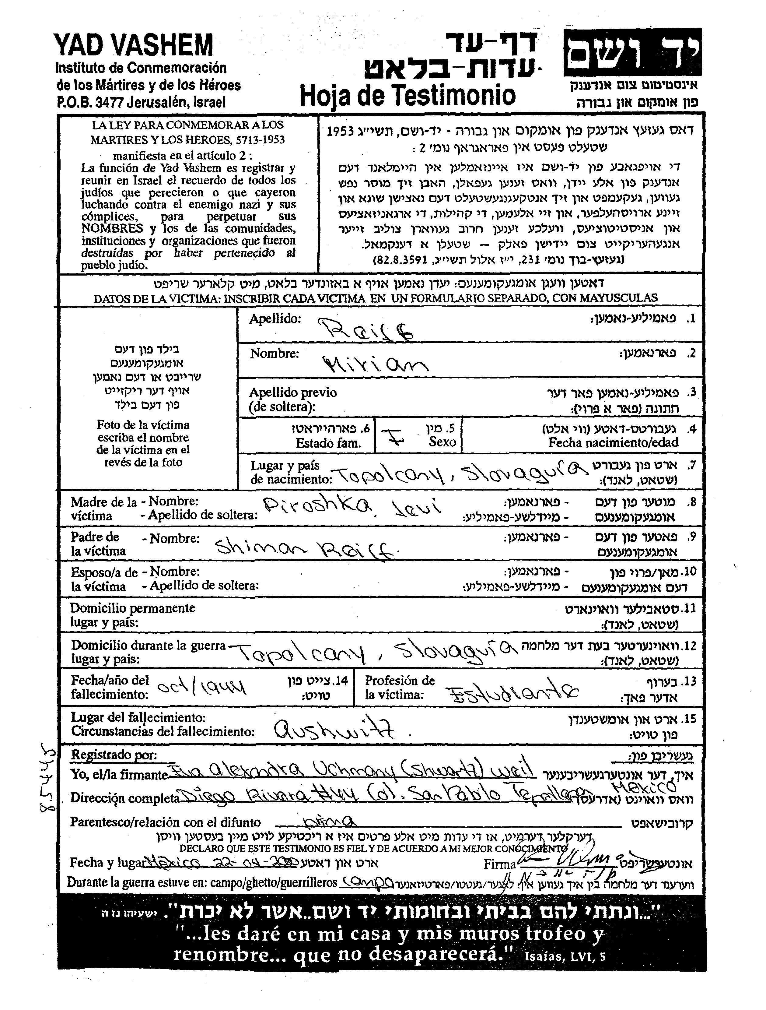 Мирьям Рейфф, место рождения: Топольчани, Чехословакия. Отец: Шимон, mать:Пирошка. Студент / студентка. Место во время войны: Топольчани, Чехословакия.