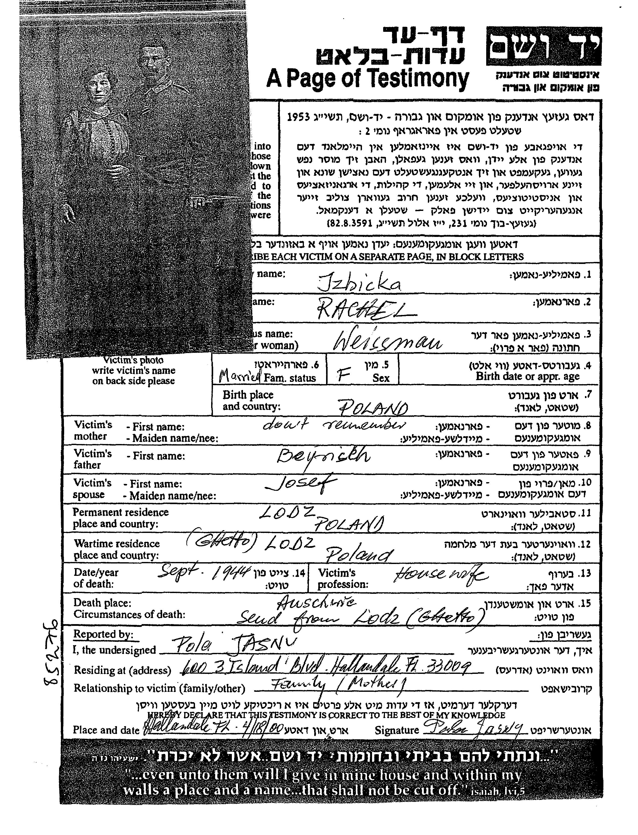 Избицка Рахель Лодзь, Польша Лист свидетельских показаний