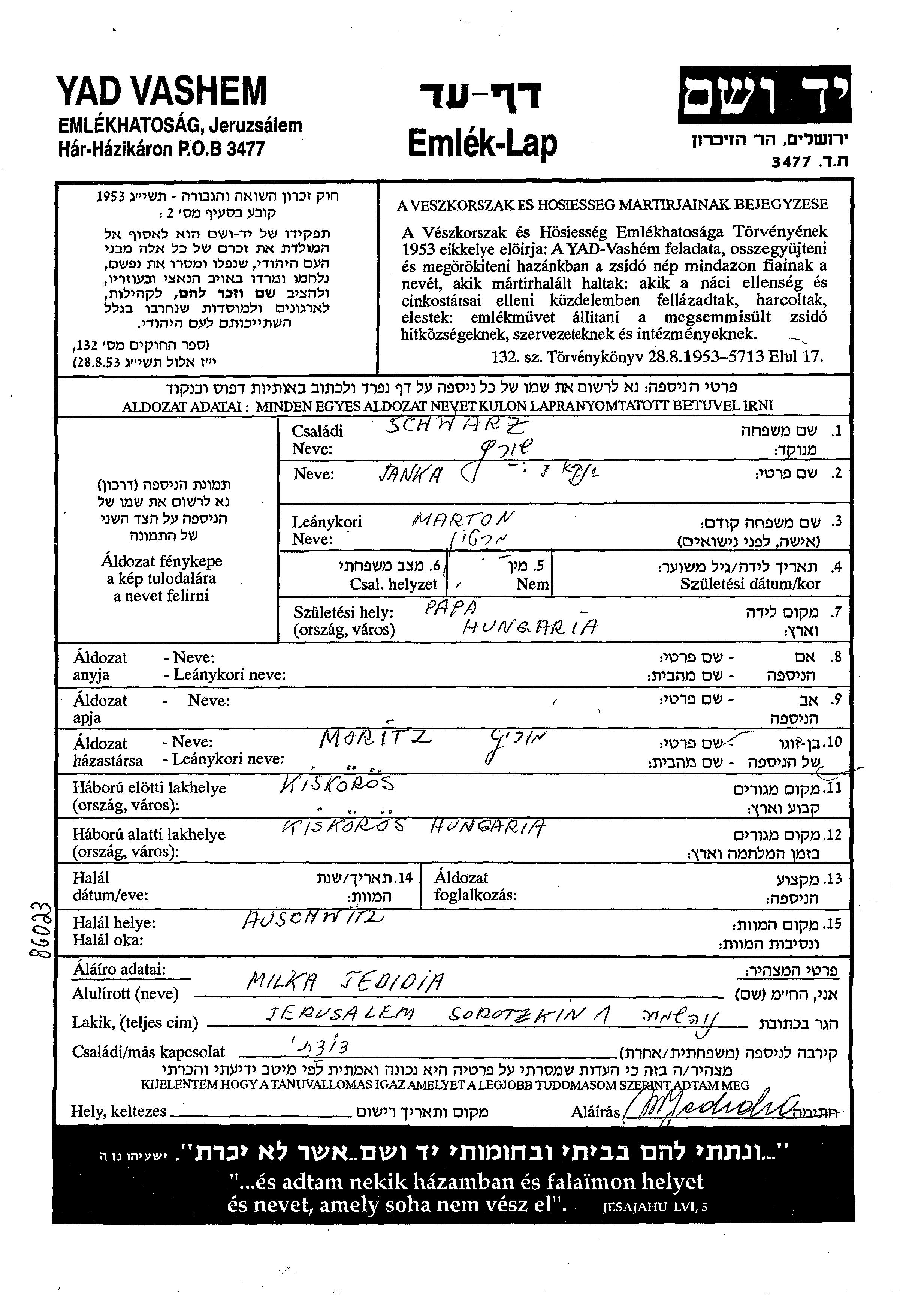 Янка Шварц, девичья фамилия Мартон, место рождения: Папа, Венгрия. Женат / замужем. Место жительства до войны: Кишкёрёш, Венгрия. Место во время войны: Кишкёрёш, Венгрия.