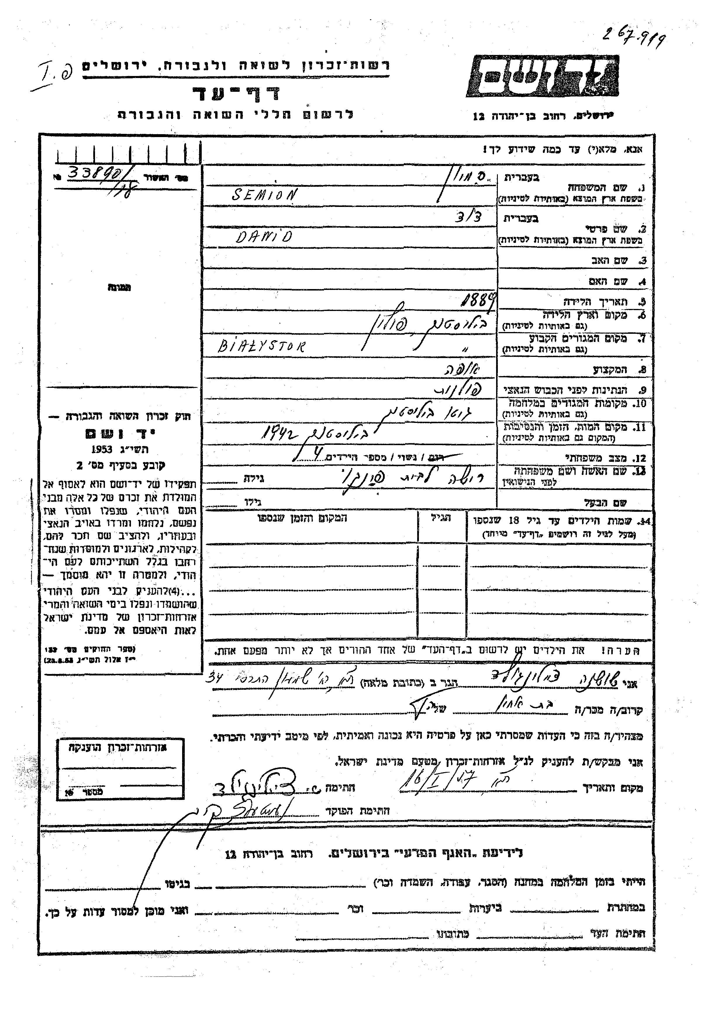Семион Давид 1889 Белосток, Польша Лист свидетельских показаний