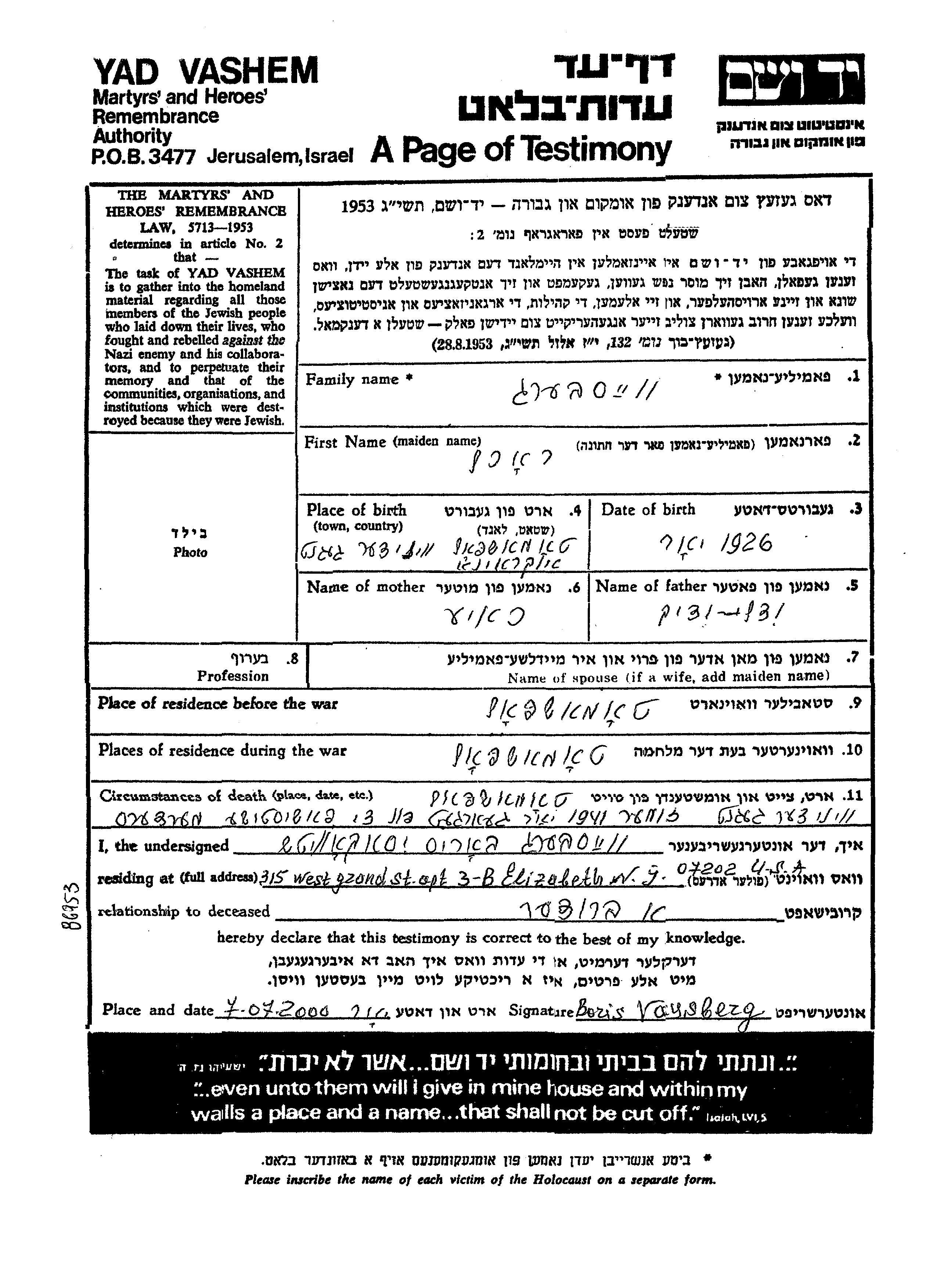 Вейсберг Рахель 1926 Томашполь, Украина (СССР) Лист свидетельских показаний