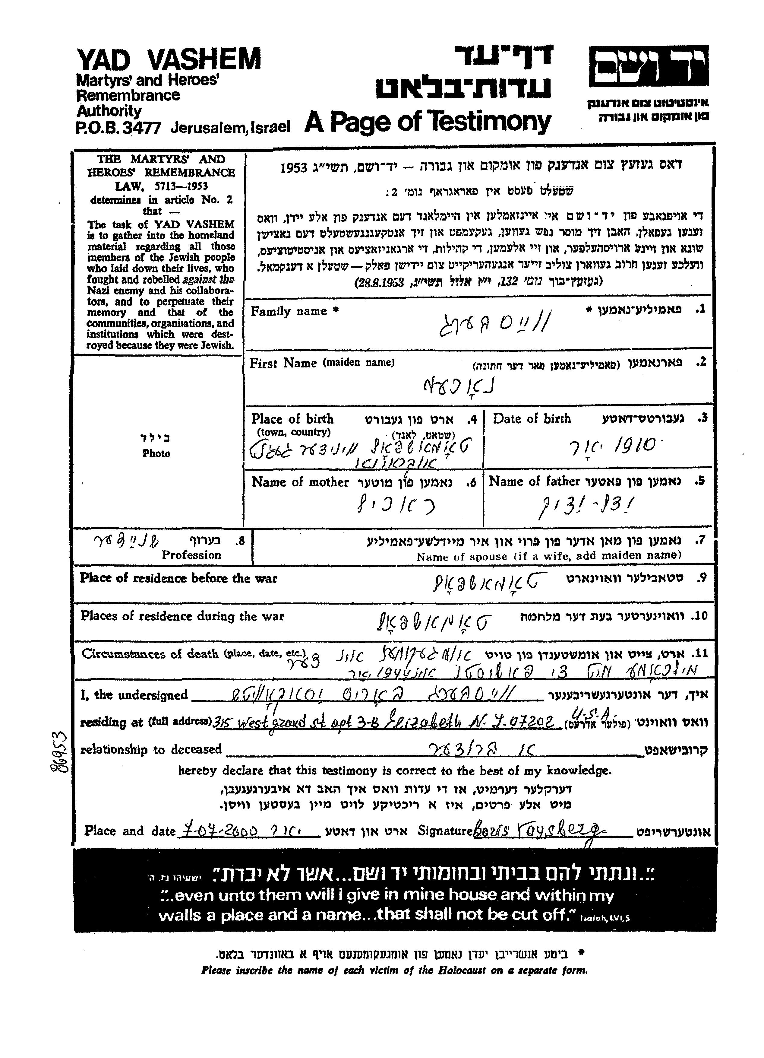 Нахем уничтожен в период Шоа. место смерти: неизвестно в 1944.