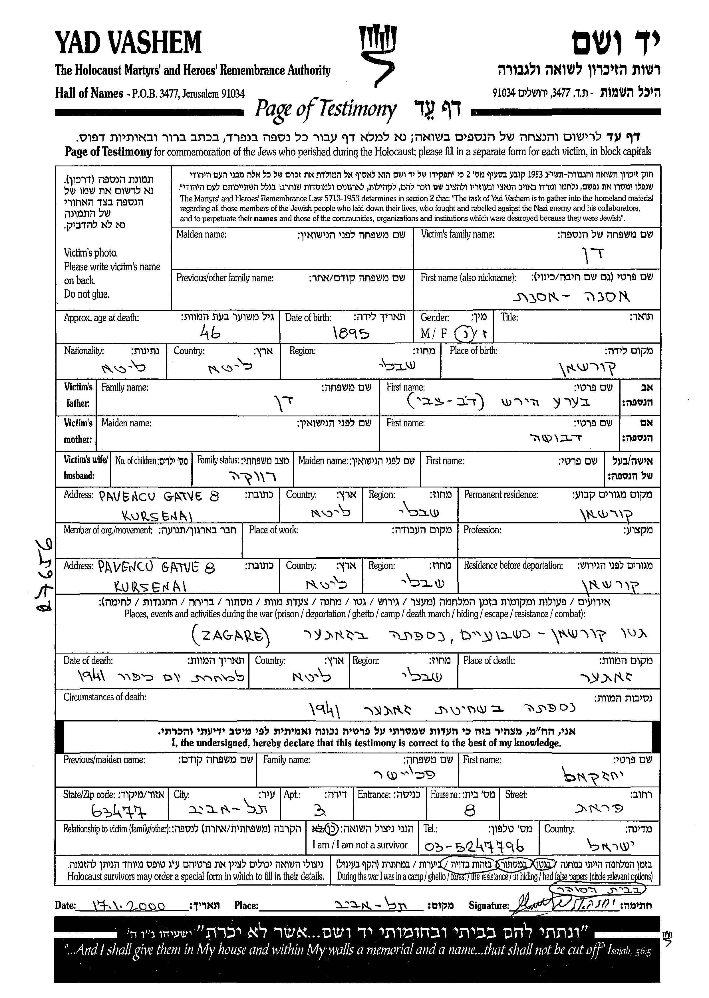 Дан Асна 1895 Куршан, Литва Лист свидетельских показаний