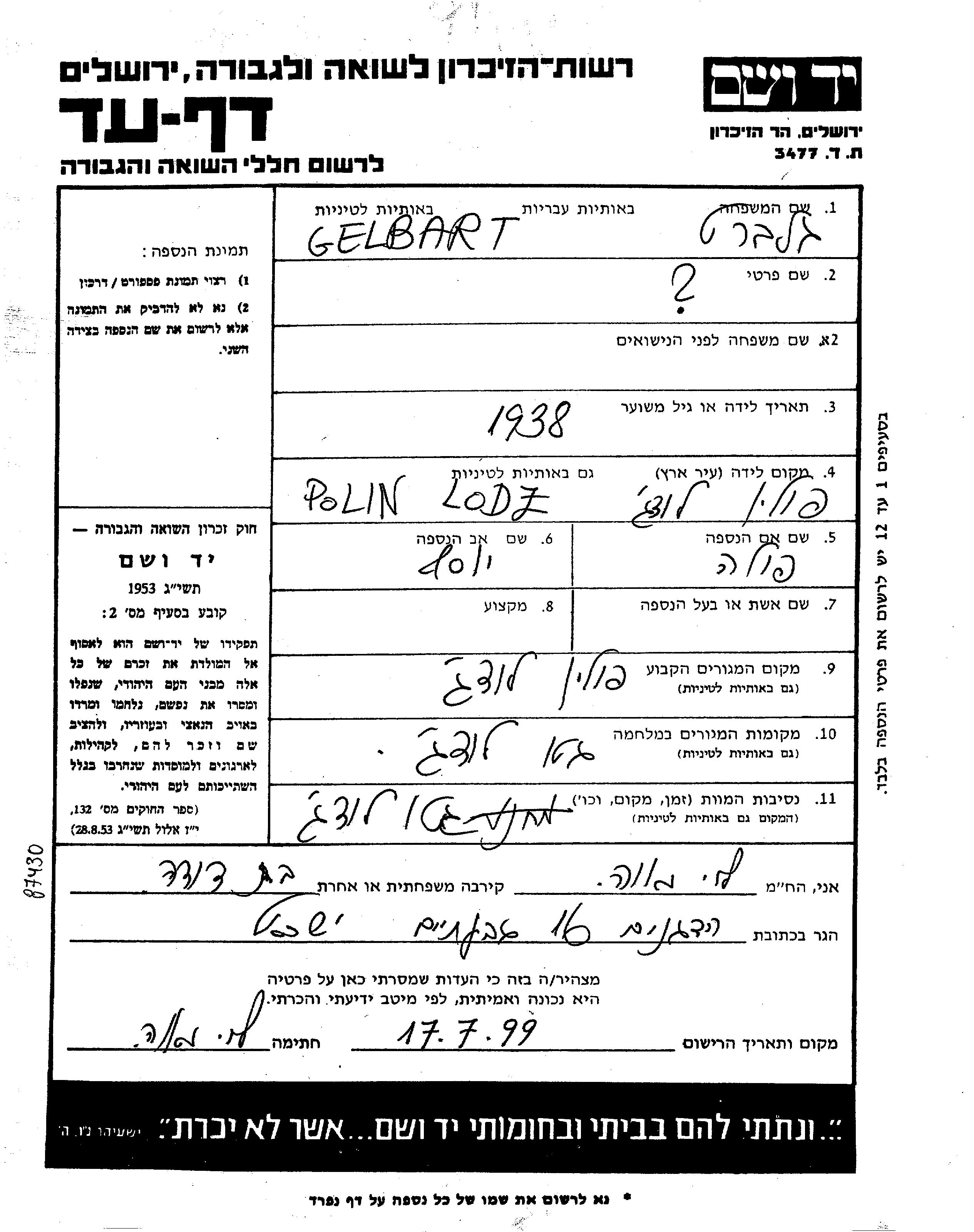 Гельбарт Имя неизвестно 1938 Лодзь, Польша Лист свидетельских показаний