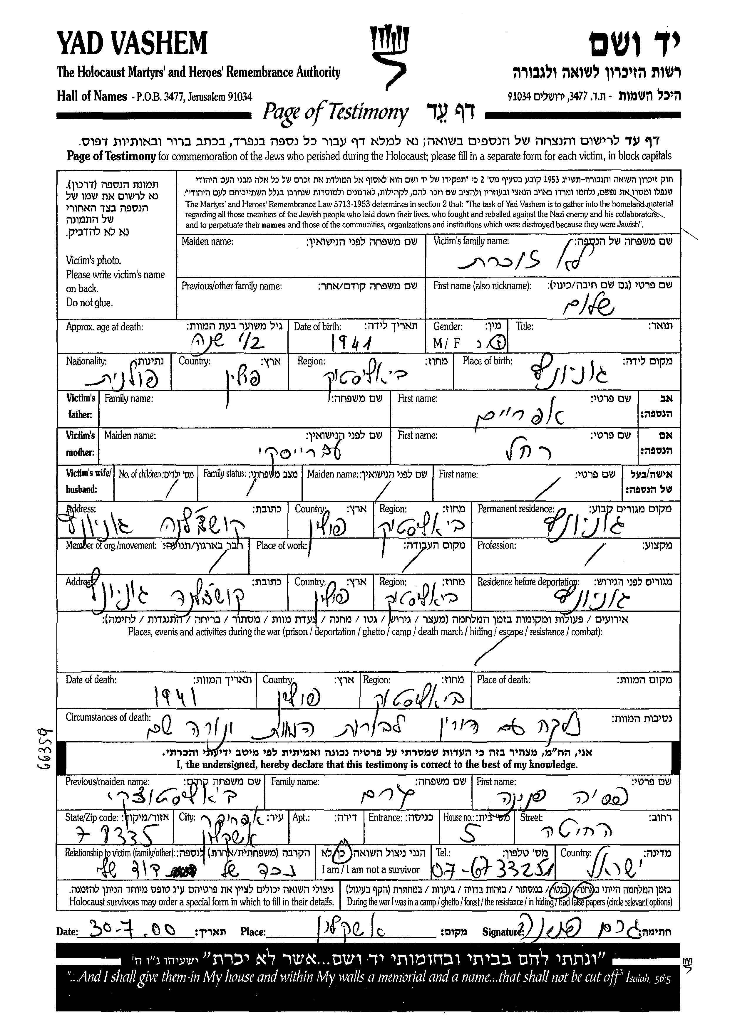 Фамилия неизвестна Шалом 1941 Гонёндз, Польша Лист свидетельских показаний