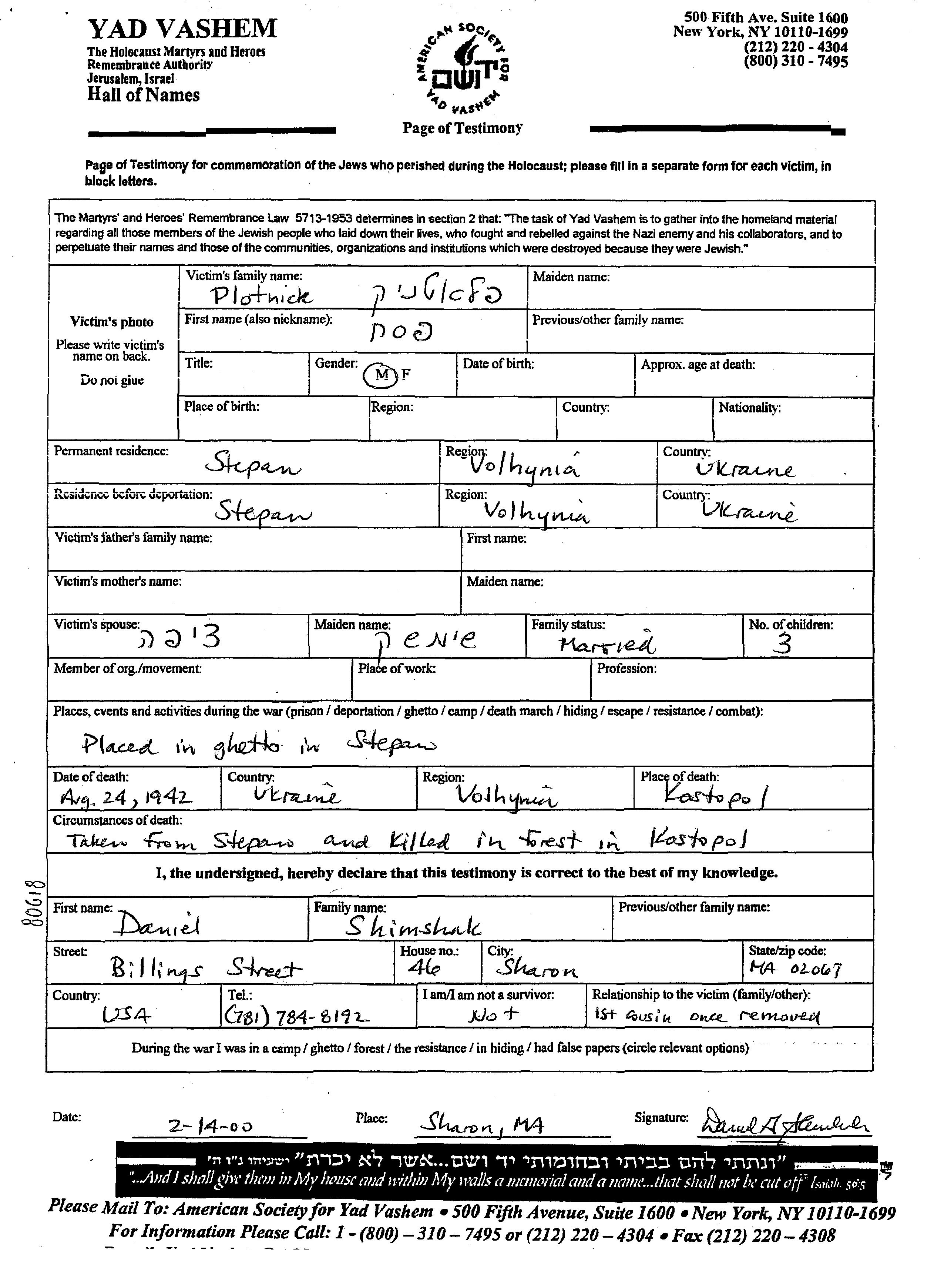 Песах Плотник. Женат / замужем. Место жительства до войны: Степань, Польша. Место во время войны: Степань, Польша.