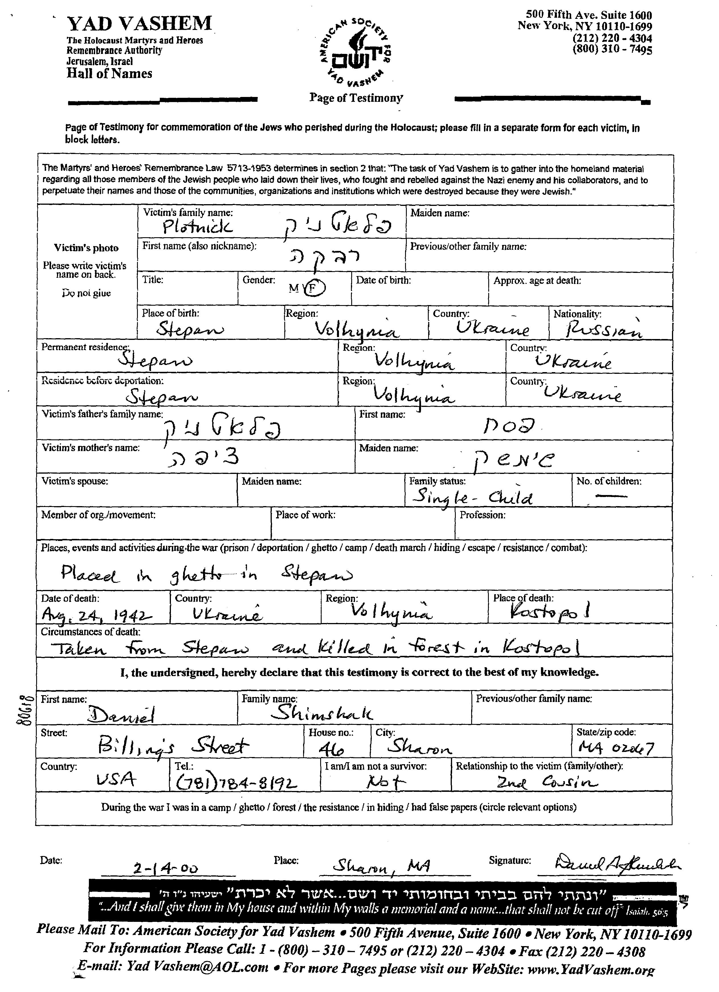 Ривка Плотник, место рождения: Степань, Польша. Отец: Песах, mать:Ципа. Ребенок. Место жительства до войны: Степань, Польша. Место во время войны: Степань, Польша.