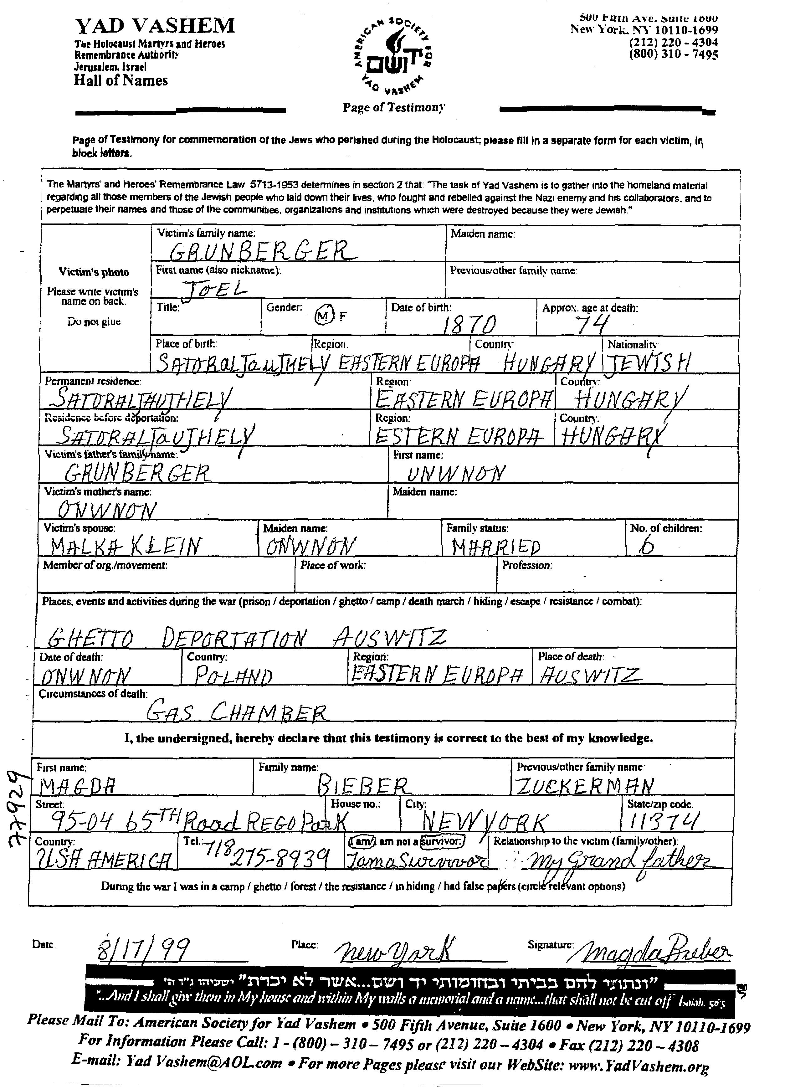 Йоэль Грунбергер, место рождения: Шаторальяуйхей, Венгрия. Женат / замужем. Место жительства до войны: Шаторальяуйхей, Венгрия. Место во время войны: Шаторальяуйхей, Венгрия.