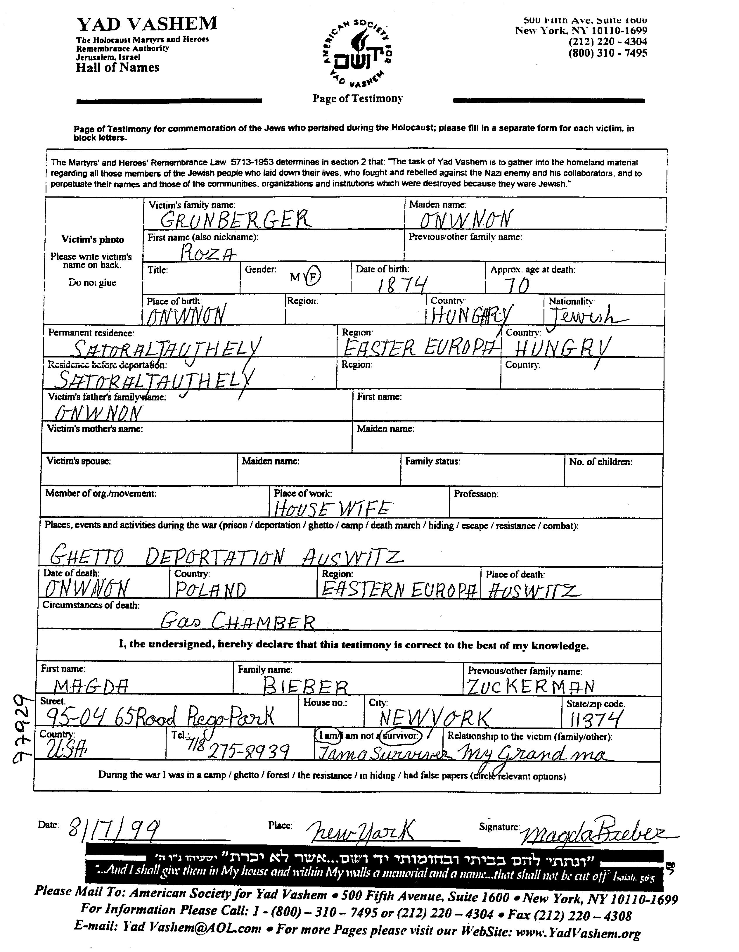 Роза Грунбергер, место рождения: Венгрия. Домохозяйка. Место жительства до войны: Шаторальяуйхей, Венгрия. Место во время войны: Шаторальяуйхей, Венгрия.