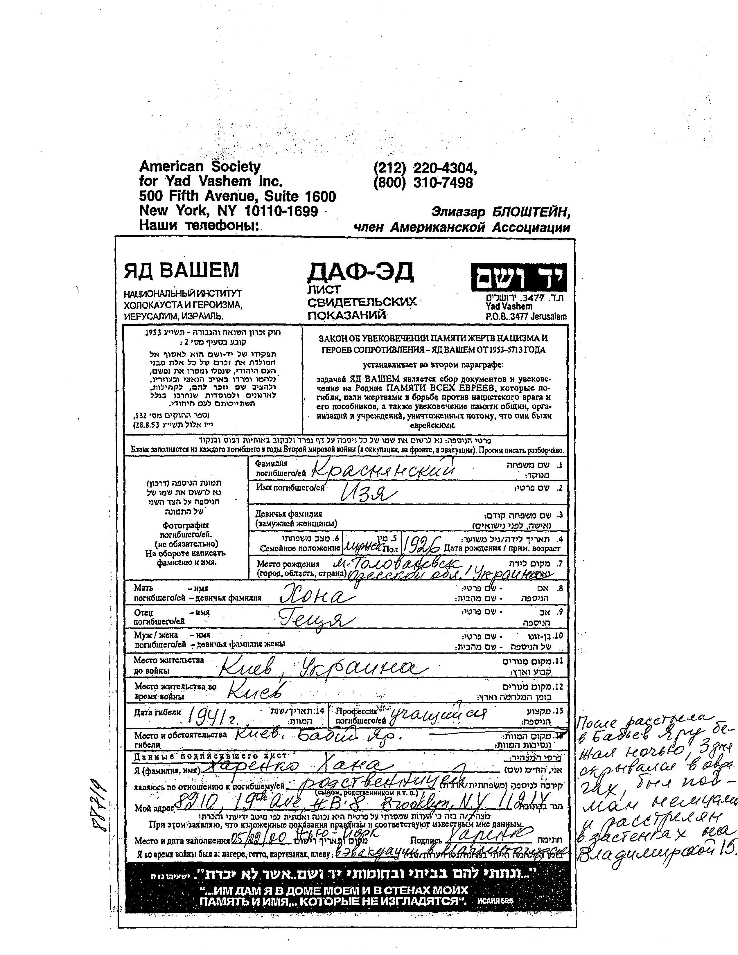 Краснянский Изя 1926 Киев, Украина (СССР) Лист свидетельских показаний