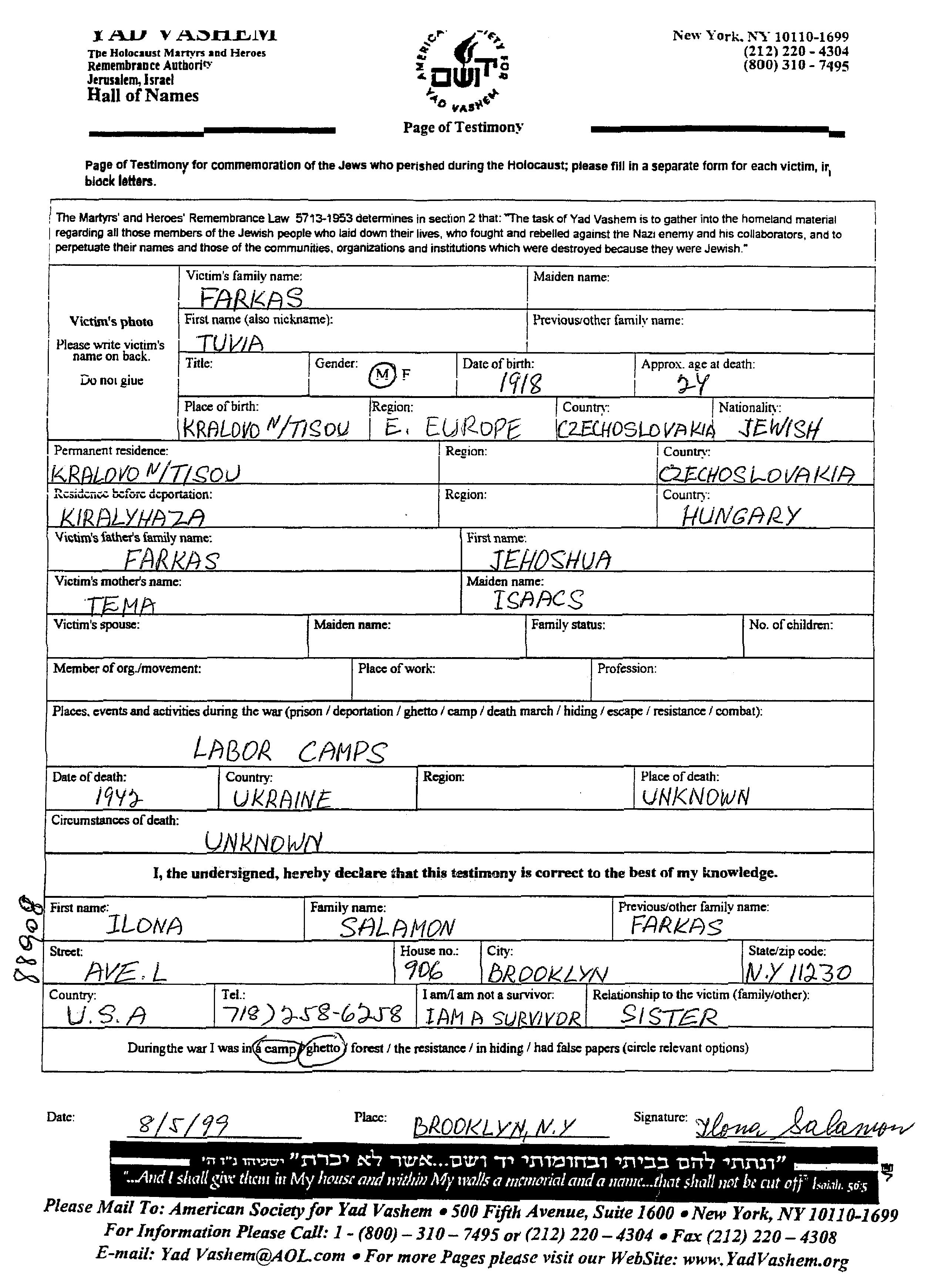 Тувия Фаркаш, место рождения: Кралово Над Тисоу, Чехословакия. Отец: Иегошуа, mать:Тема. Место жительства до войны: Кралово Над Тисоу, Чехословакия. Место во время войны: Кралово Над Тисоу, Чехословакия.