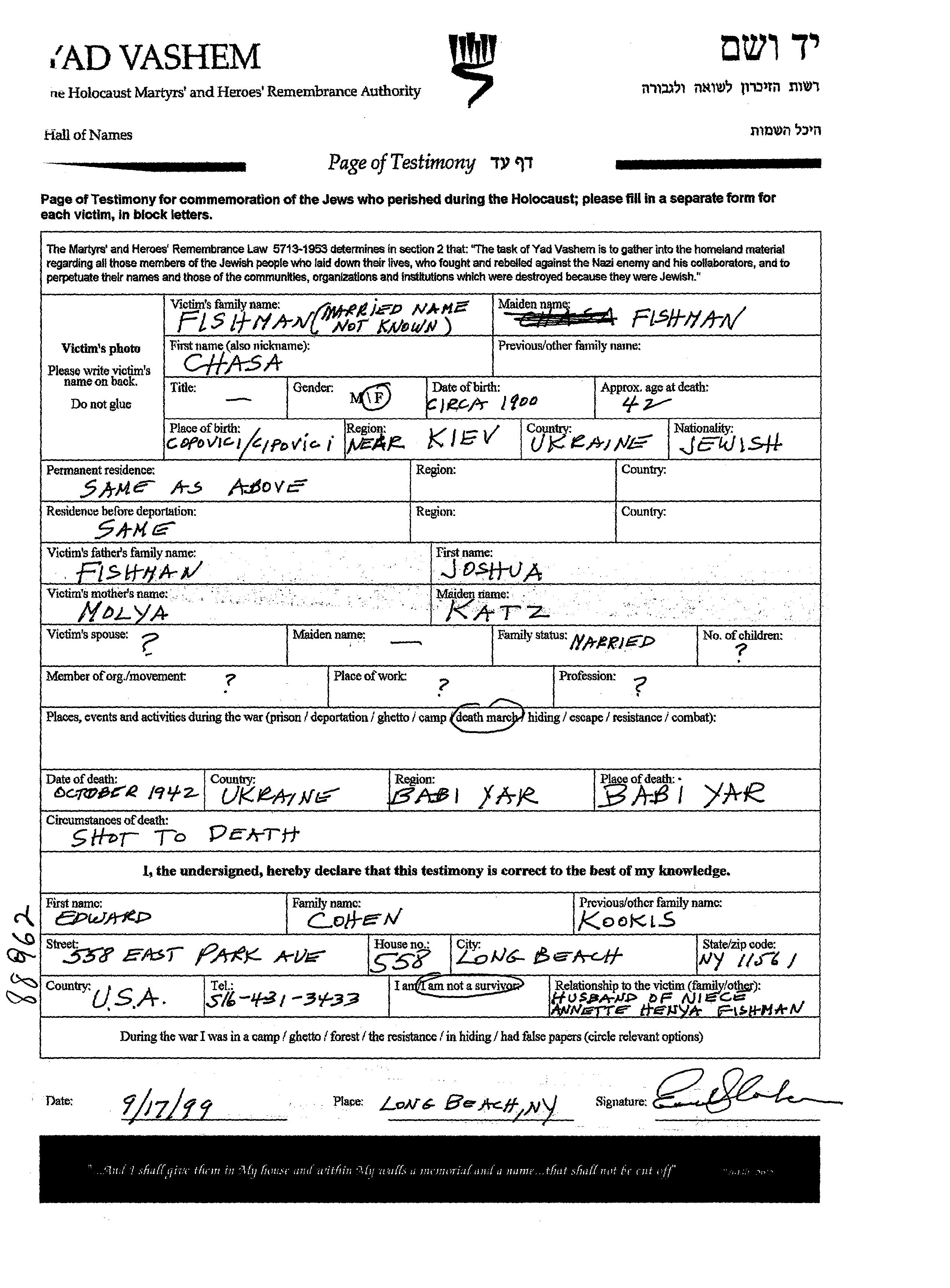 Хаса Фамилия неизвестна, девичья фамилия Фишман, место рождения: Чаповичи, Украина (СССР). Отец: Иошуа, mать:Моля. Женат / замужем. Место жительства до войны: Чаповичи, Украина (СССР). Место во время войны: Чаповичи, Украина (СССР).