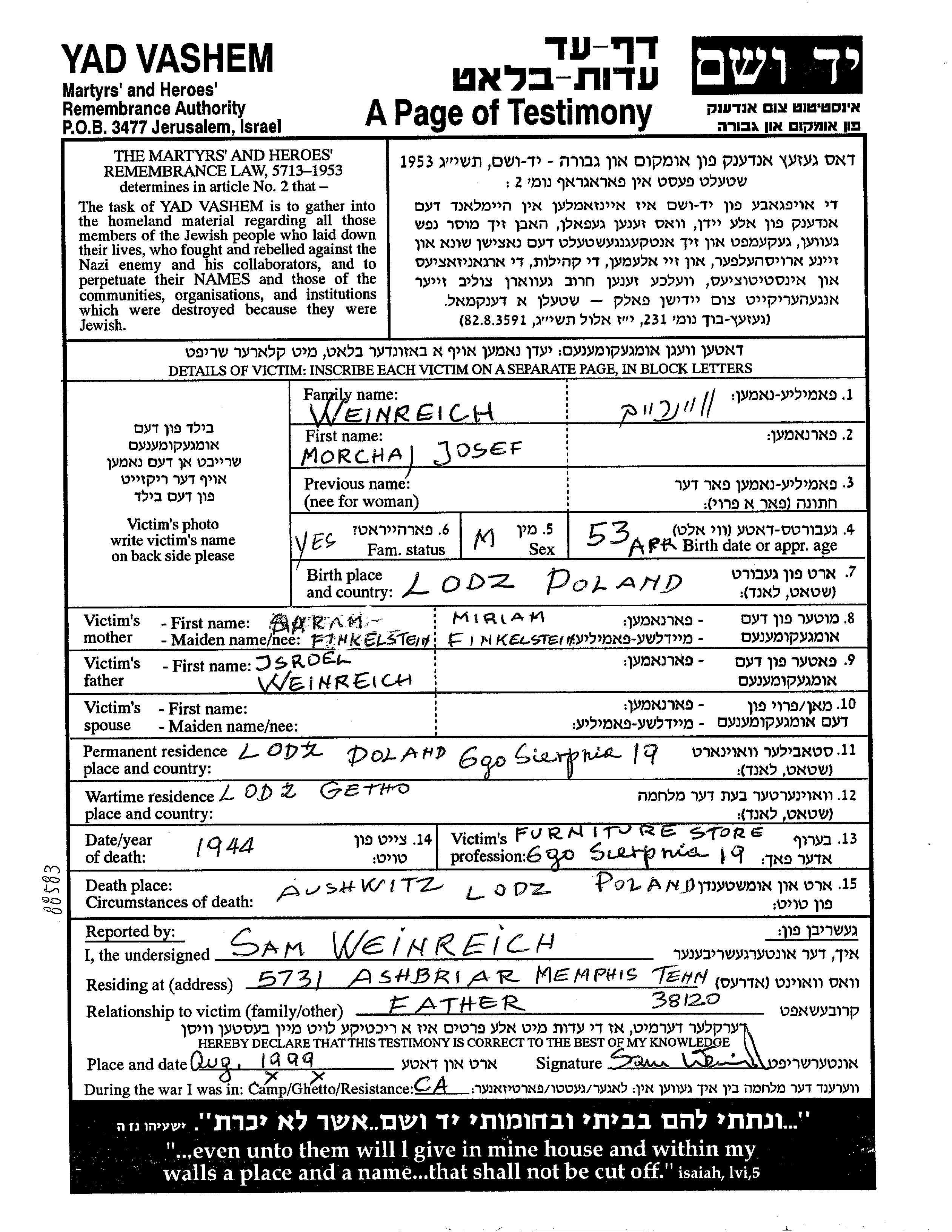 Мордхай Йосеф Вейнрейх, место рождения: Лодзь, Польша. Отец: Исроэль, mать:Мирьям. Работник / работница мебельного магазина. Женат / замужем. Место жительства до войны: Лодзь, Польша. Место во время войны: Лодзь, Польша.
