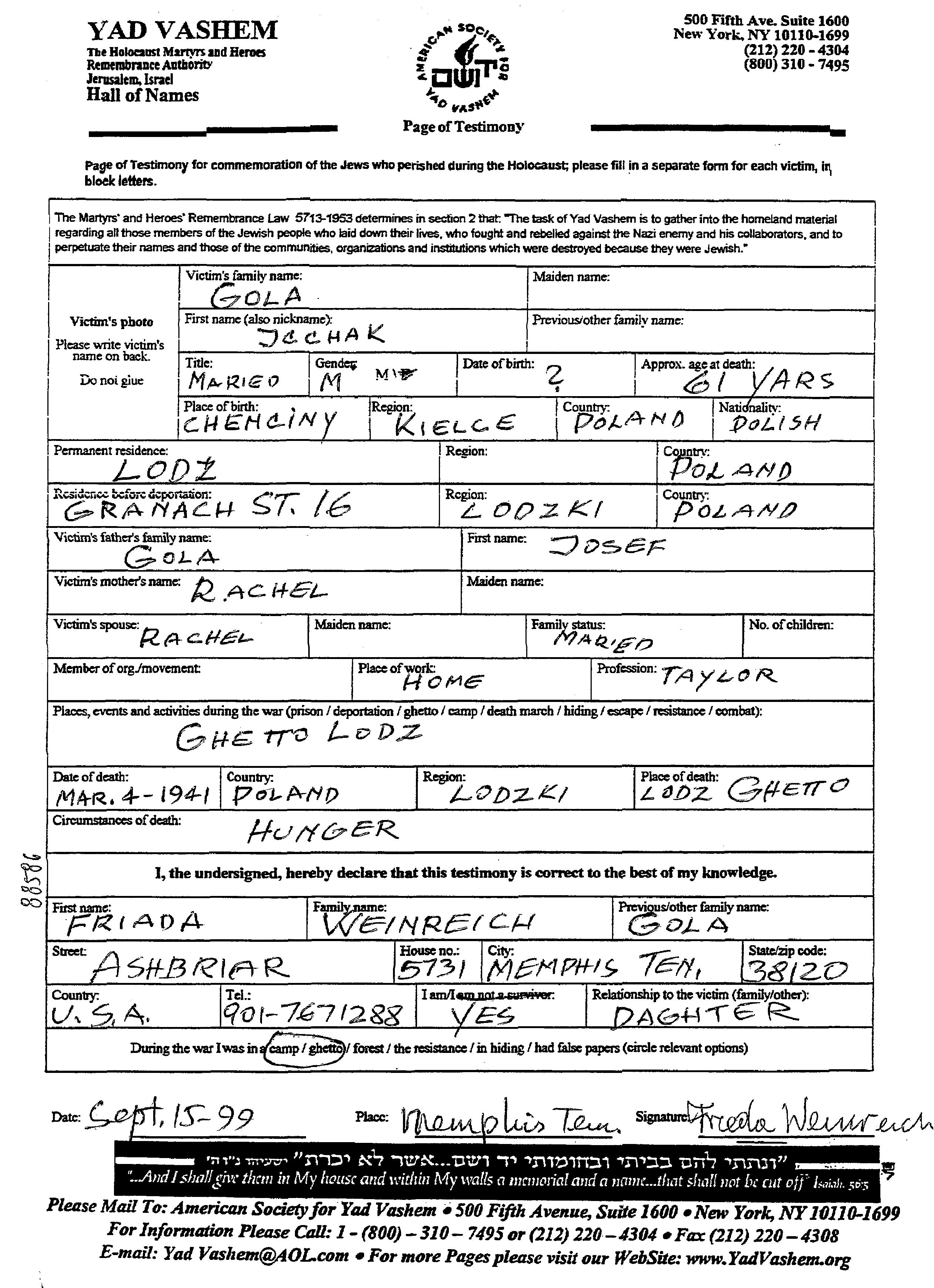 Гола Ицхак Лодзь, Польша Лист свидетельских показаний