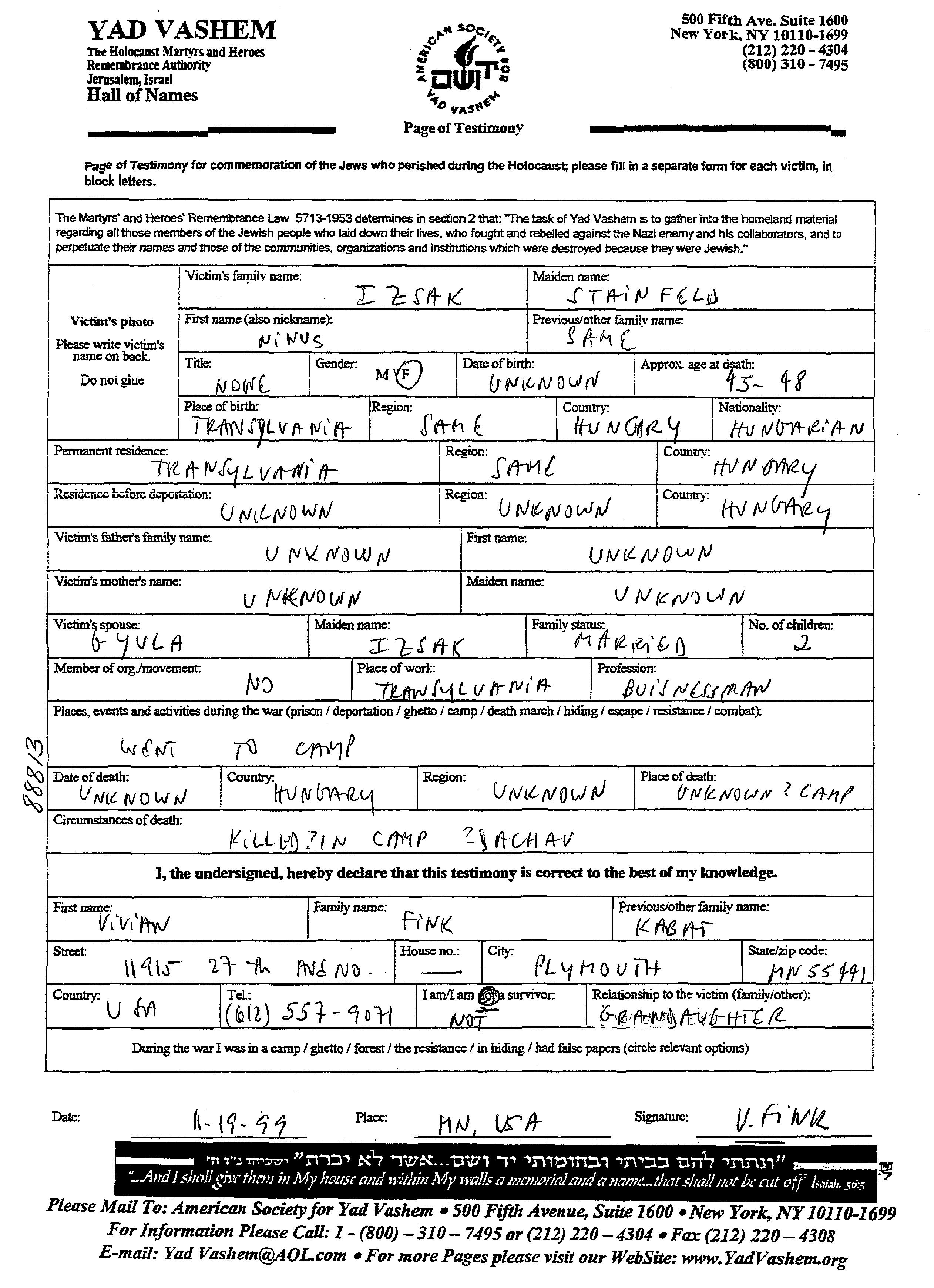 Нинуш Ижак, девичья фамилия Штайнфельд, место рождения: Трансильвания, Румыния. Предприниматель. Женат / замужем. Место жительства до войны: Трансильвания, Румыния. Место во время войны: Венгрия.