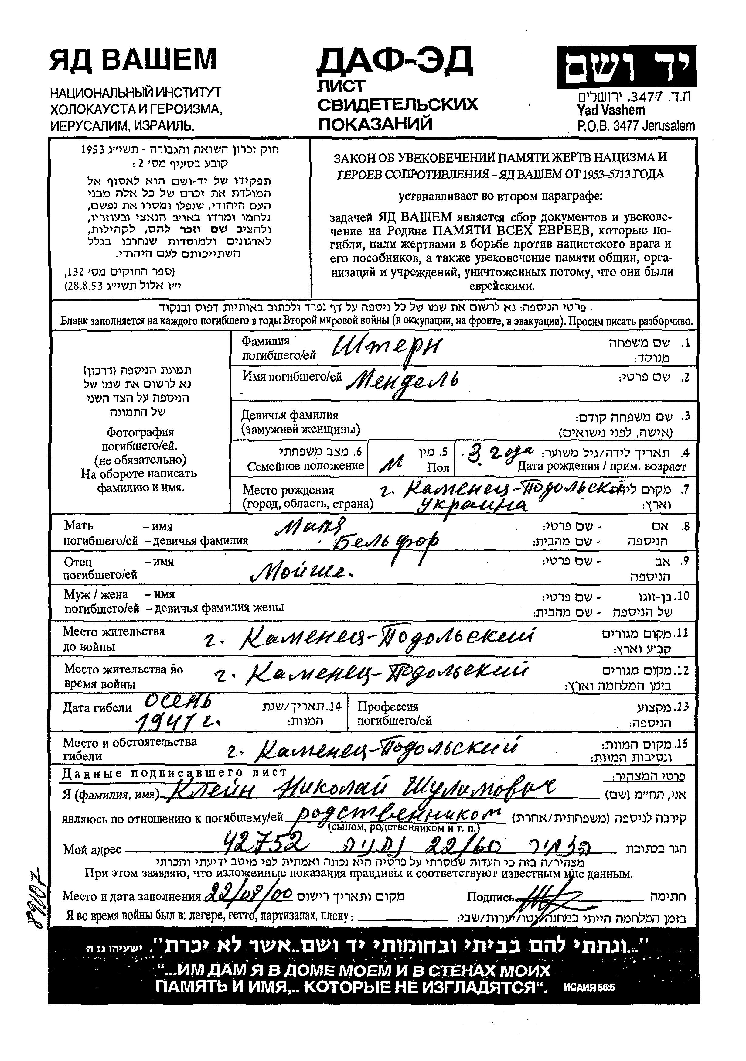 Штерн Мендель Каменец-Подольский, Украина (СССР) Лист свидетельских показаний