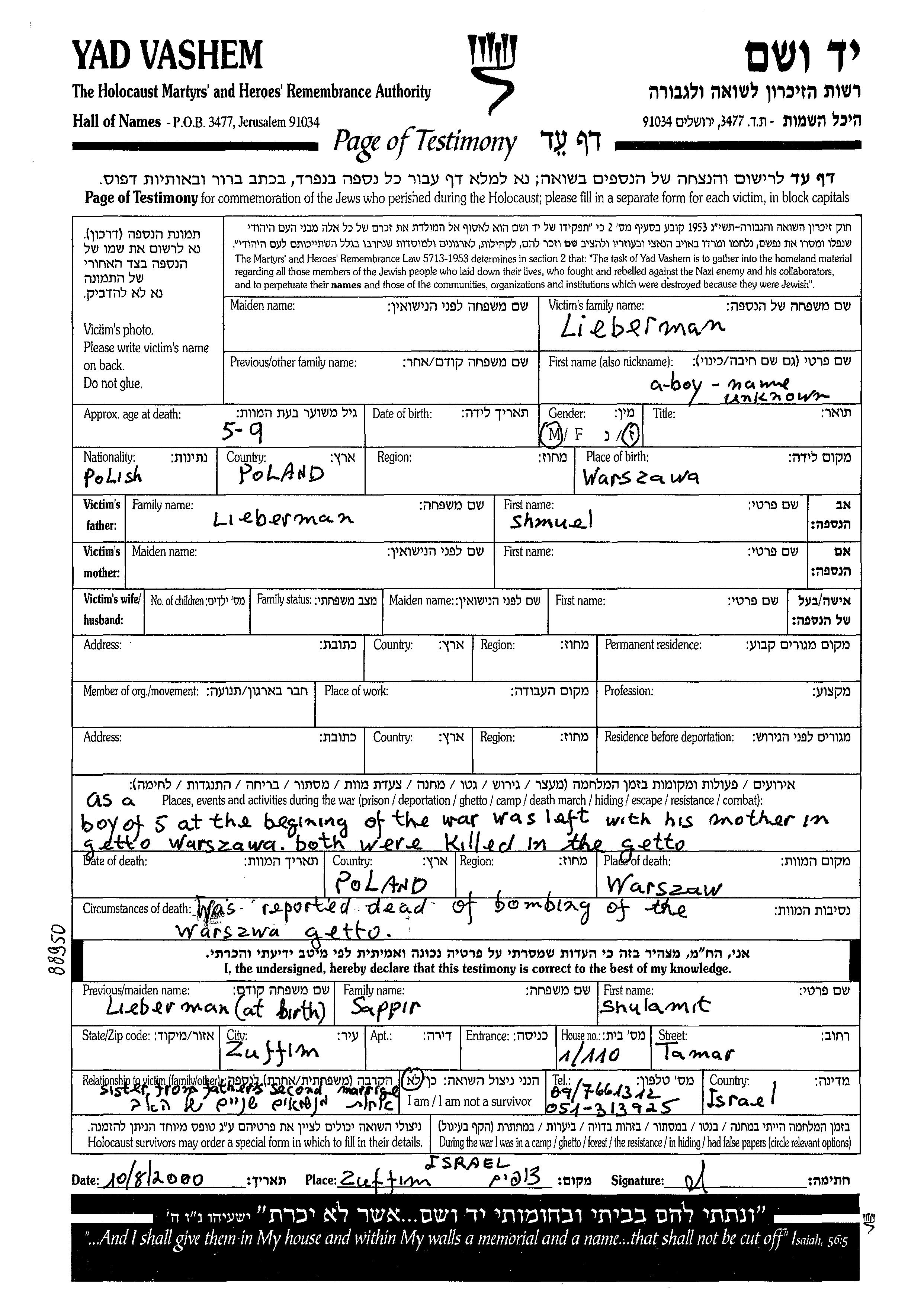 Имя неизвестно Либерман, место рождения: Варшава, Польша. Отец: Шмуэль. Место во время войны: Варшава, Польша.