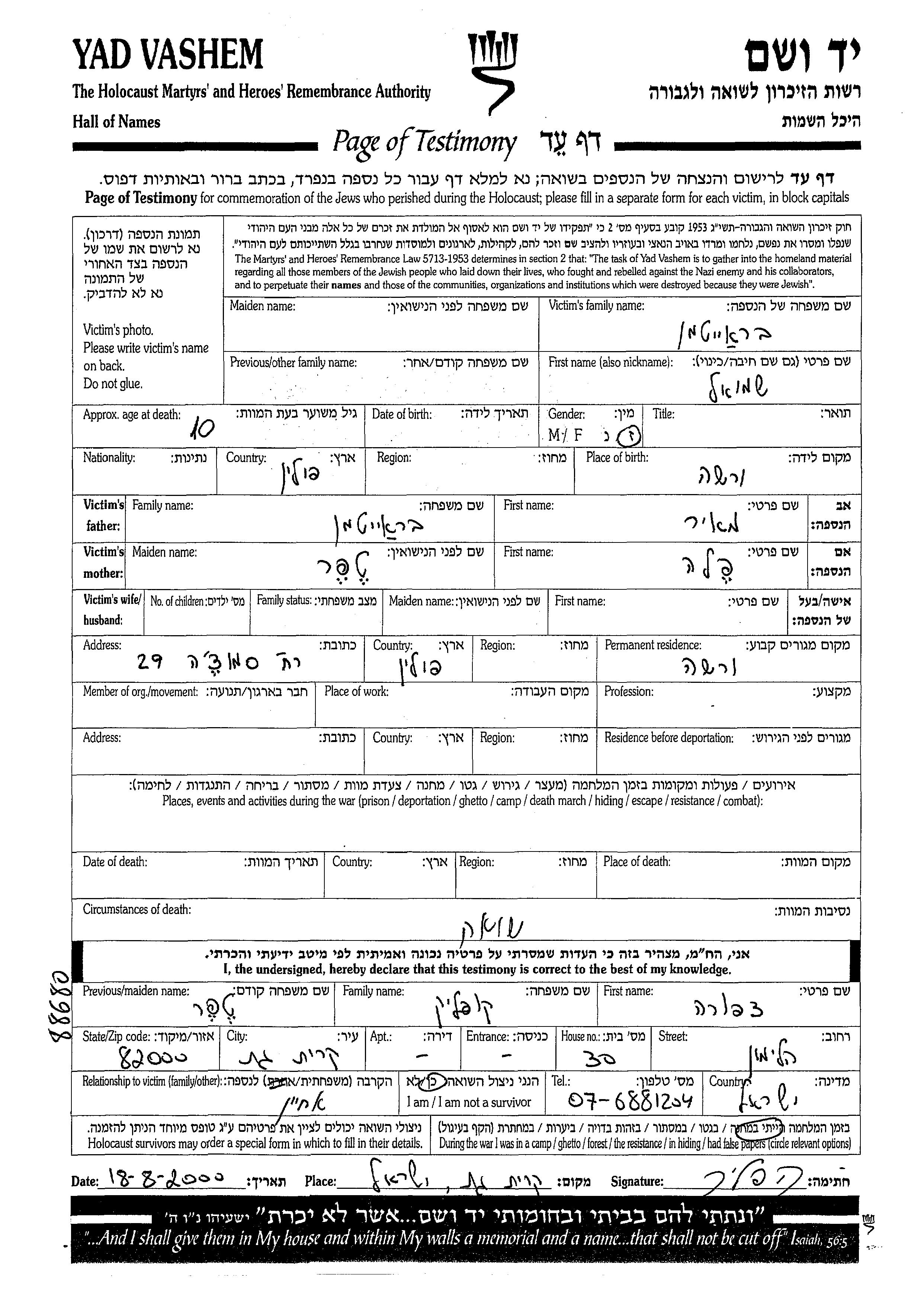 Яд Вашем - Листы свидетельских показаний Мемориального фонда