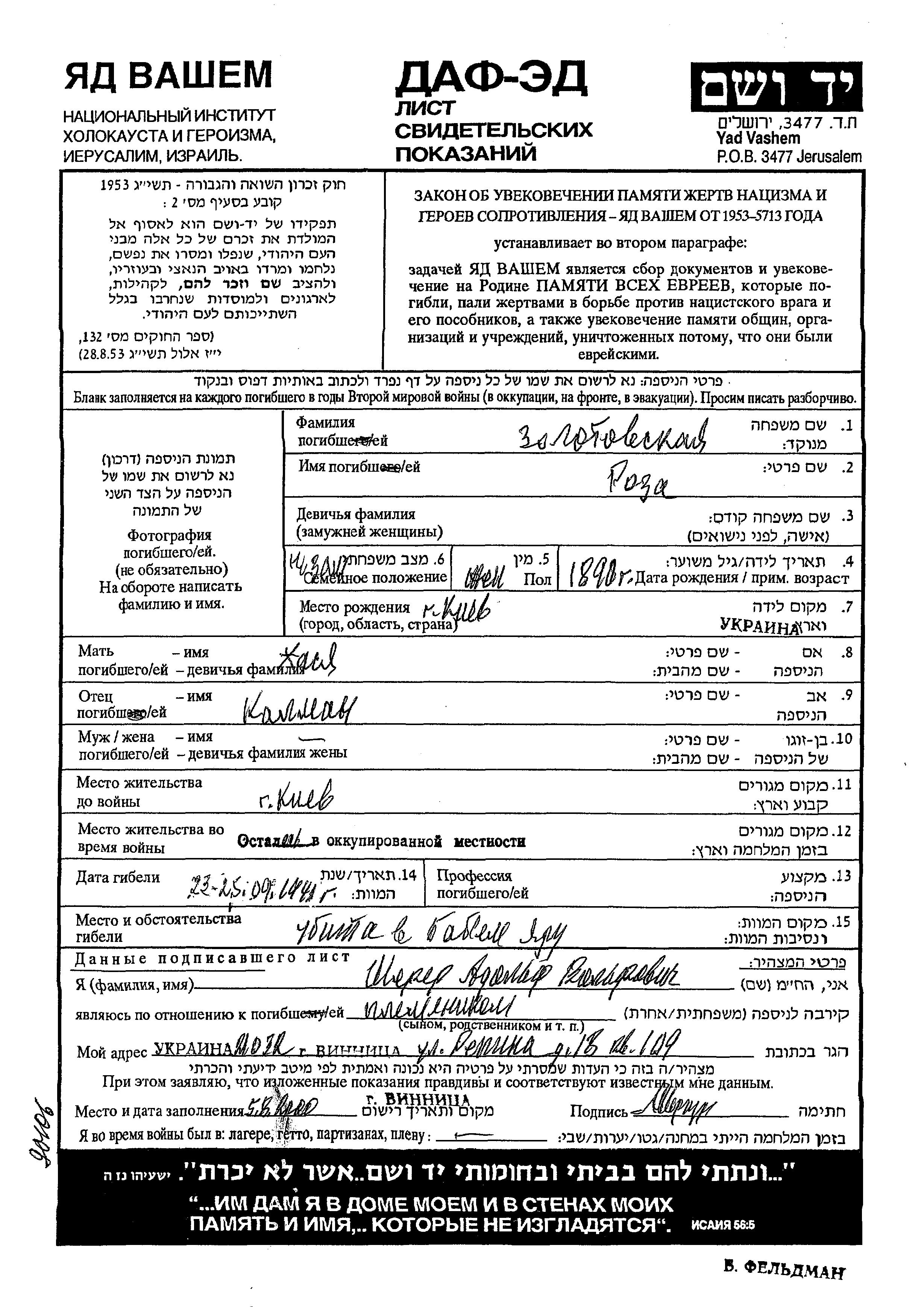Золотовская Роза 1898 Киев, Украина (СССР) Лист свидетельских показаний