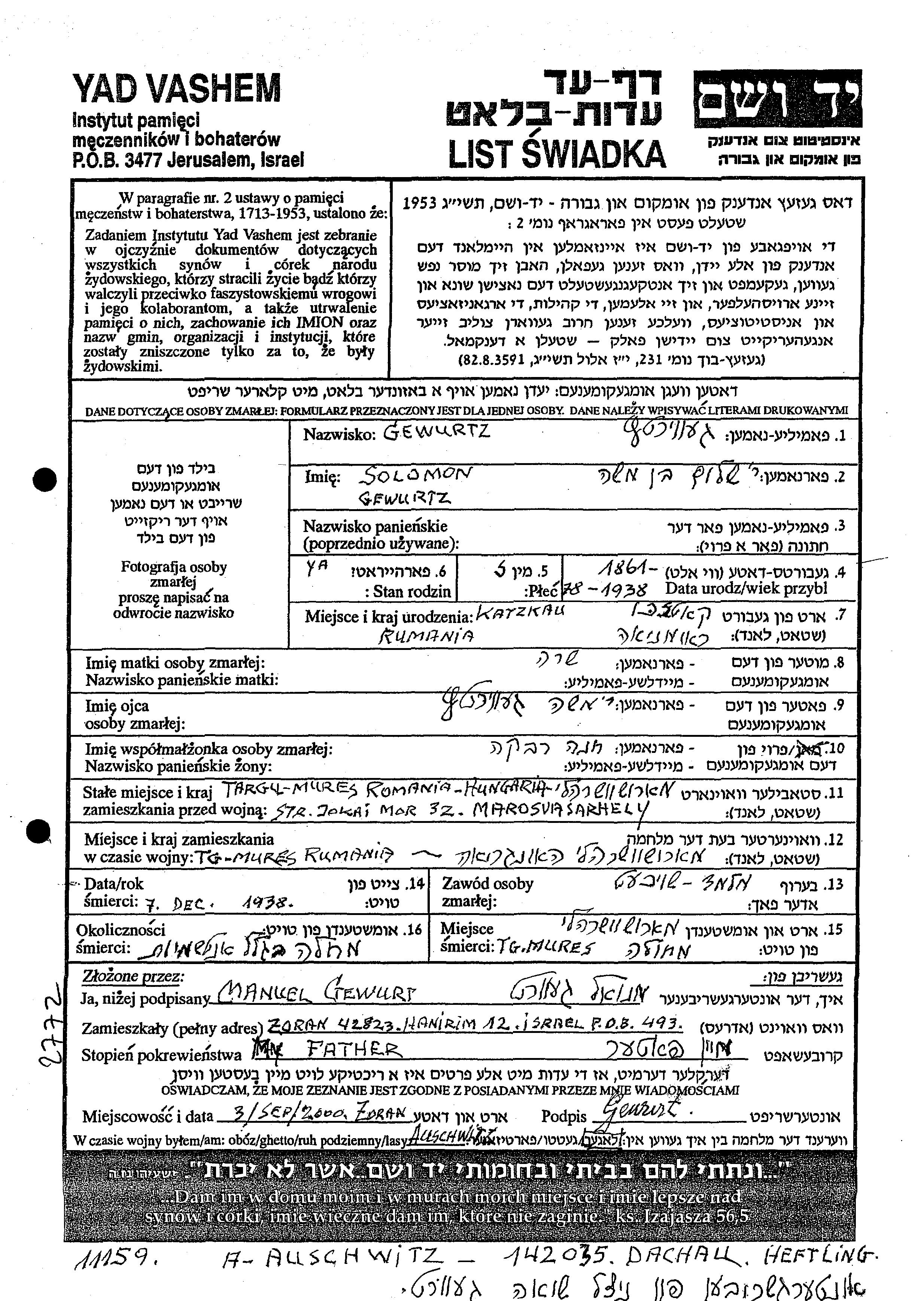 Соломон Шалом Гевурц, место рождения: Кыцкэу, Румыния. Отец: Моше, mать:Сара. Меламед. Женат / замужем. Место жительства до войны: Марошвашархей, Румыния. Место во время войны: Марошваршайхей, Румыния.