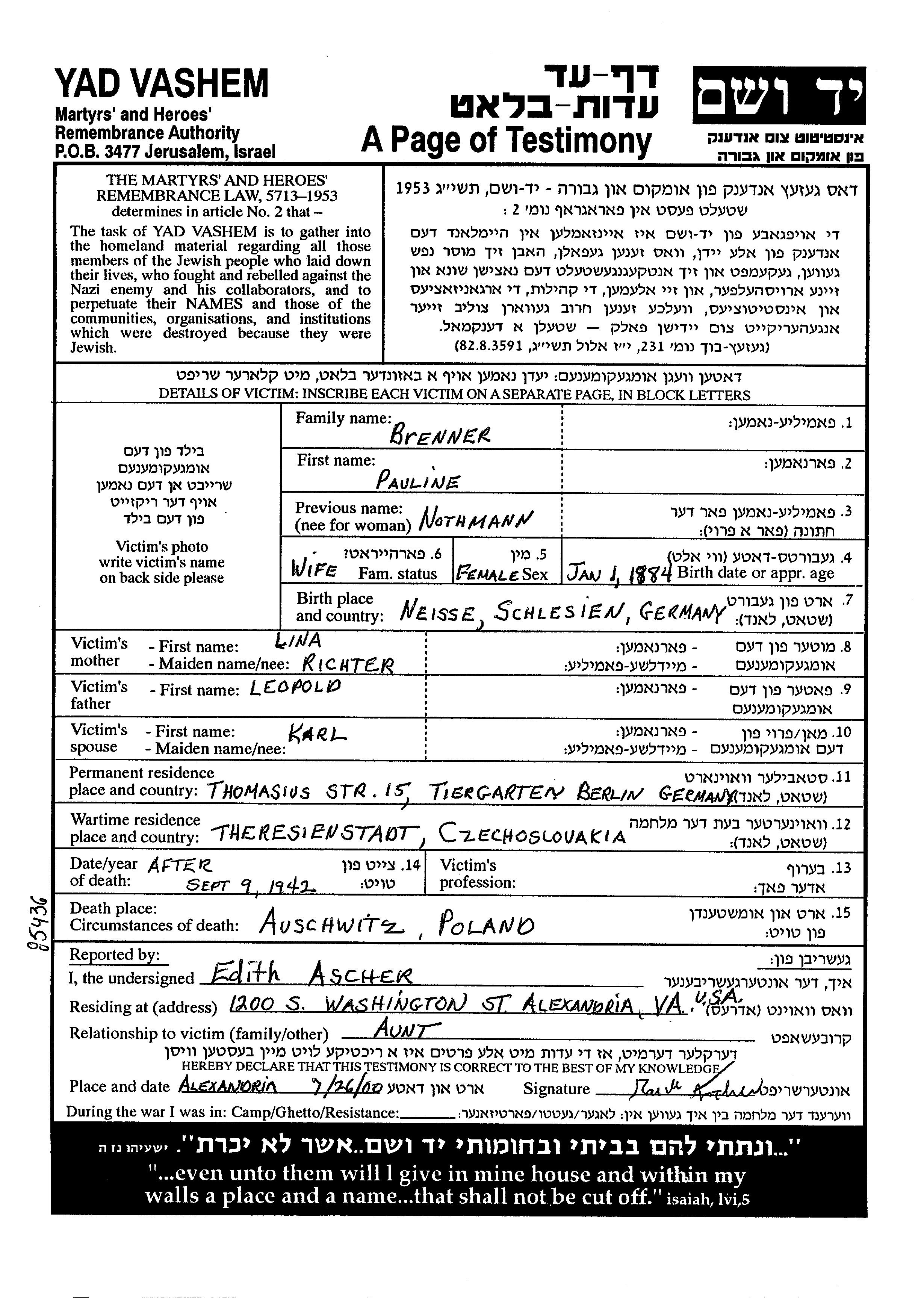 Паулине Бреннер, девичья фамилия Нотманн, место рождения: Нейссе, Германия. Отец: Леопольд, mать:Лина. Женат / замужем. Место жительства до войны: Берлин, Германия. Место во время войны: Терезиенштадт, Чехословакия.