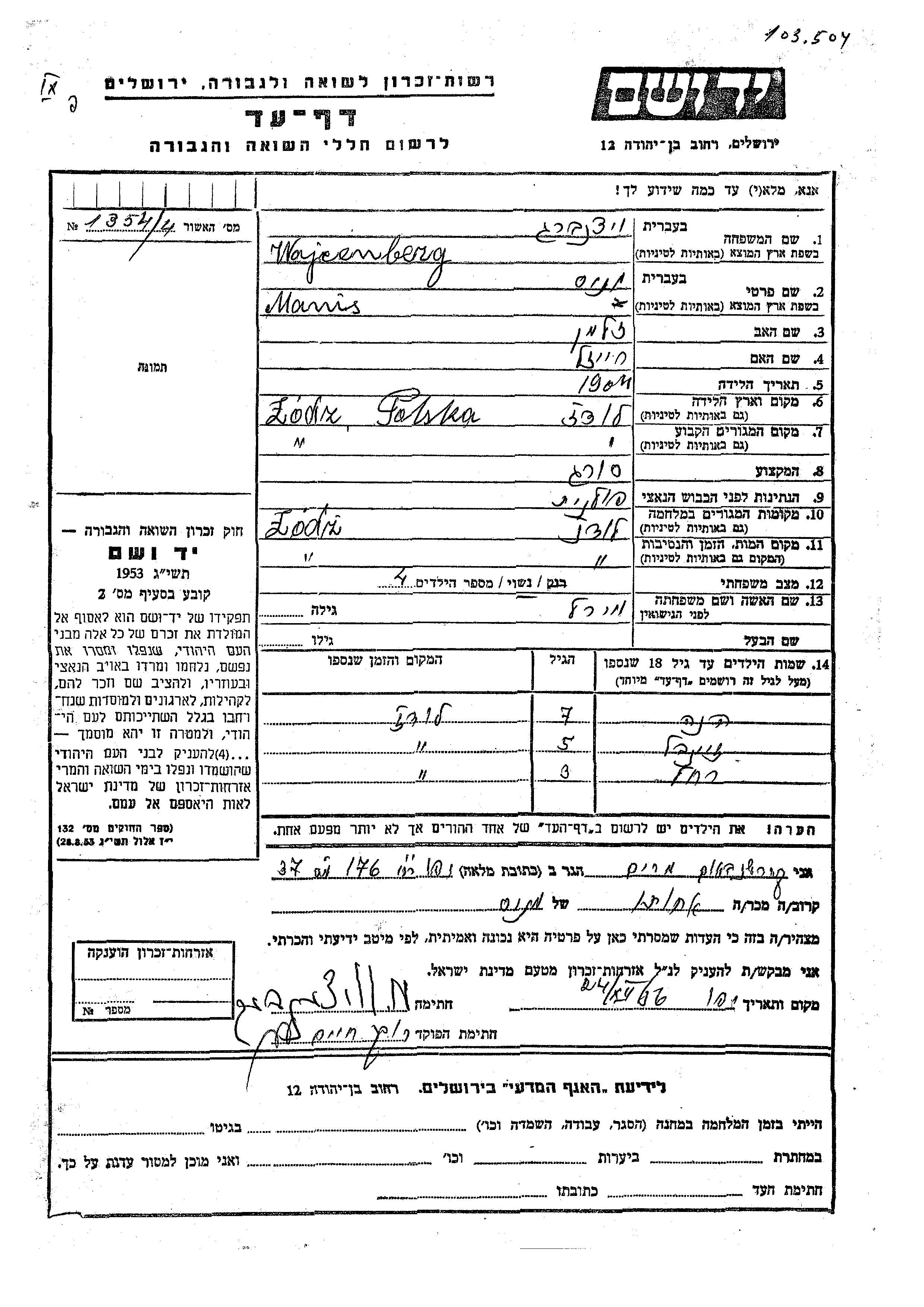 Манис Вайценберг Виценберг, место рождения: Лодзь, Польша. Отец: Залман, mать:Рейзл. Вязальщик / вязальщица. Женат / замужем. Место жительства до войны: Лодзь, Польша. Место во время войны: Лодзь, Польша.