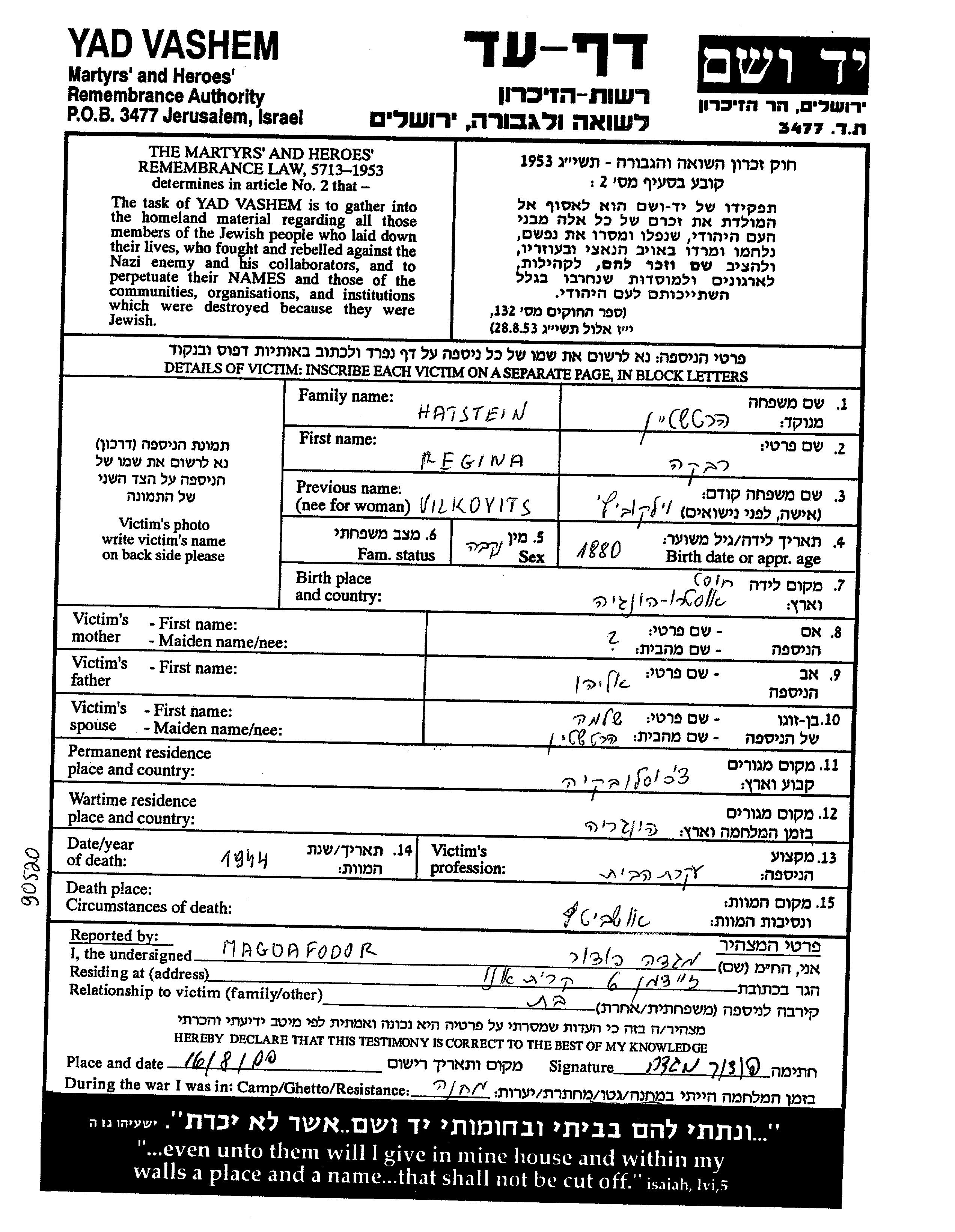 Регина Ривка Хартштейн, девичья фамилия Вилькович, место рождения: Хуст, Чехословакия. Отец: Элиягу. Домохозяйка. Женат / замужем. Место жительства до войны: Чехословакия. Место во время войны: Венгрия.