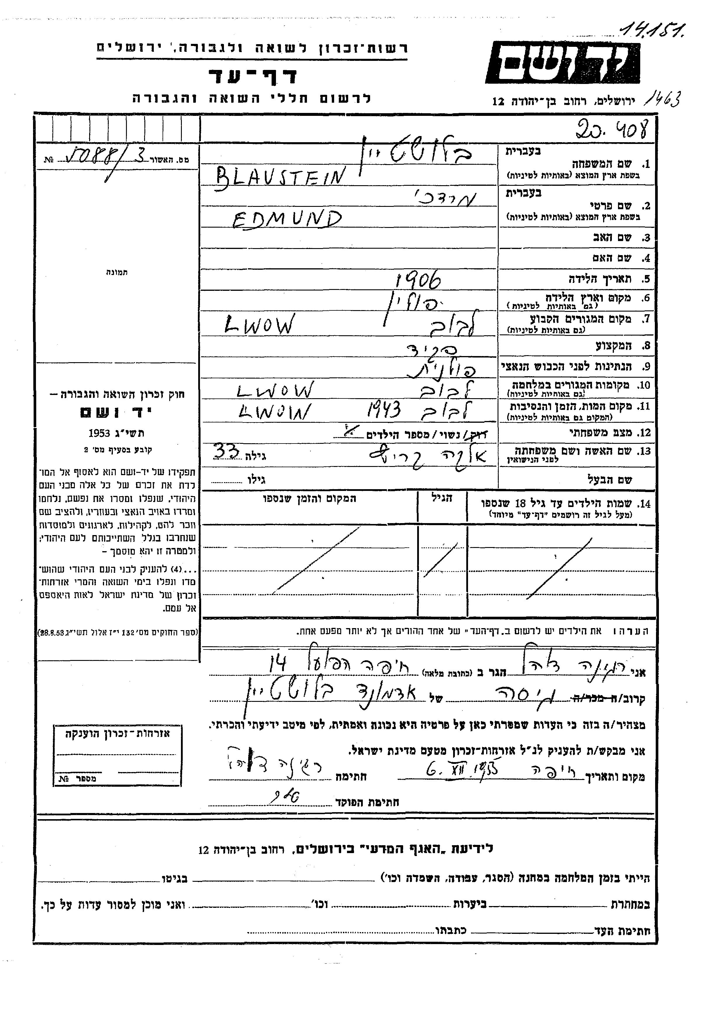 Эдмунд Мордехай Блауштайн, место рождения: Польша. Клерк. Женат / замужем. Место жительства до войны: Львов, Польша. Место во время войны: Львов, Польша.