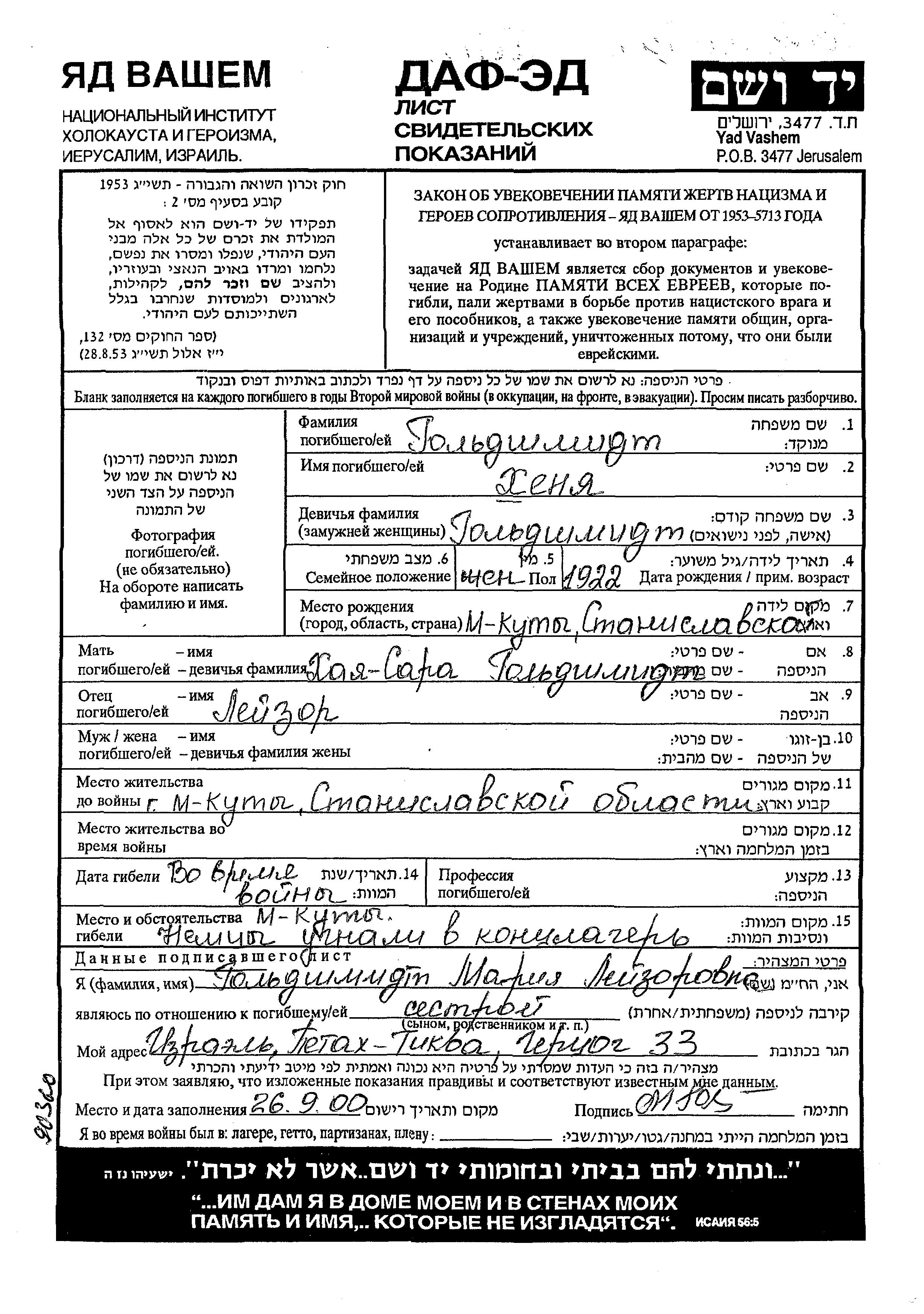 Яд Вашем - Листы свидетельских показаний Мемориального фонда