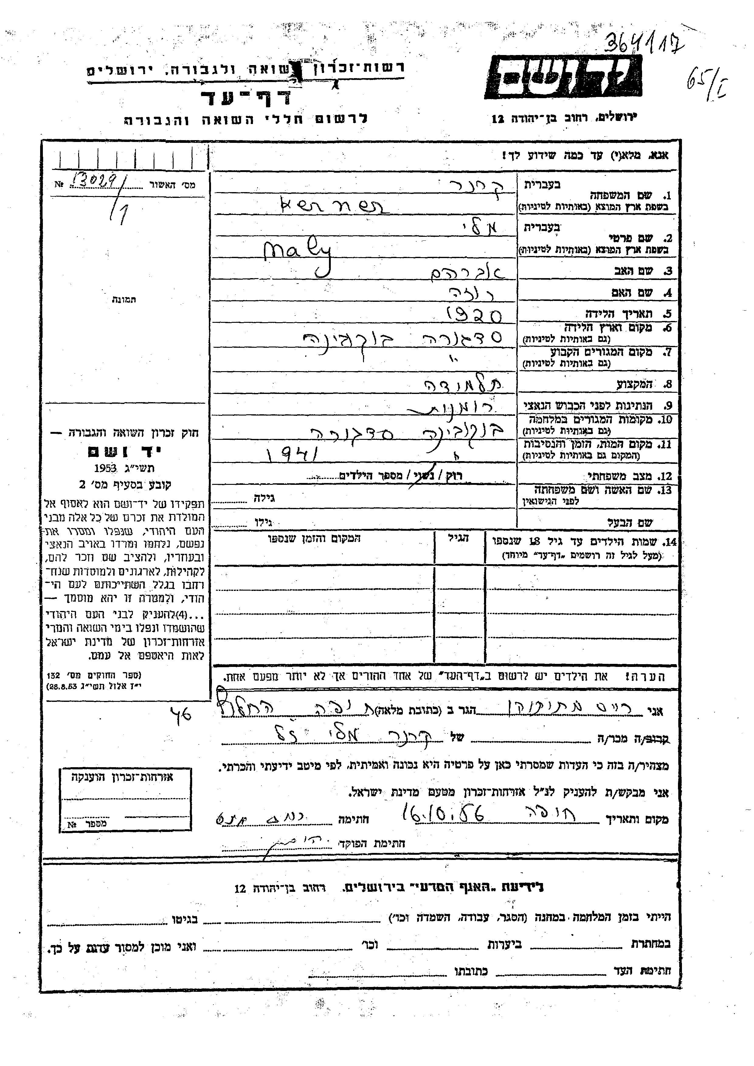 Мали Кернер, место рождения: Садагора, Румыния. Отец: Авраам, mать:Роза. Ученик / ученица. Холост / не замужем. Место жительства до войны: Садагора, Румыния. Место во время войны: Садагора, Румыния.